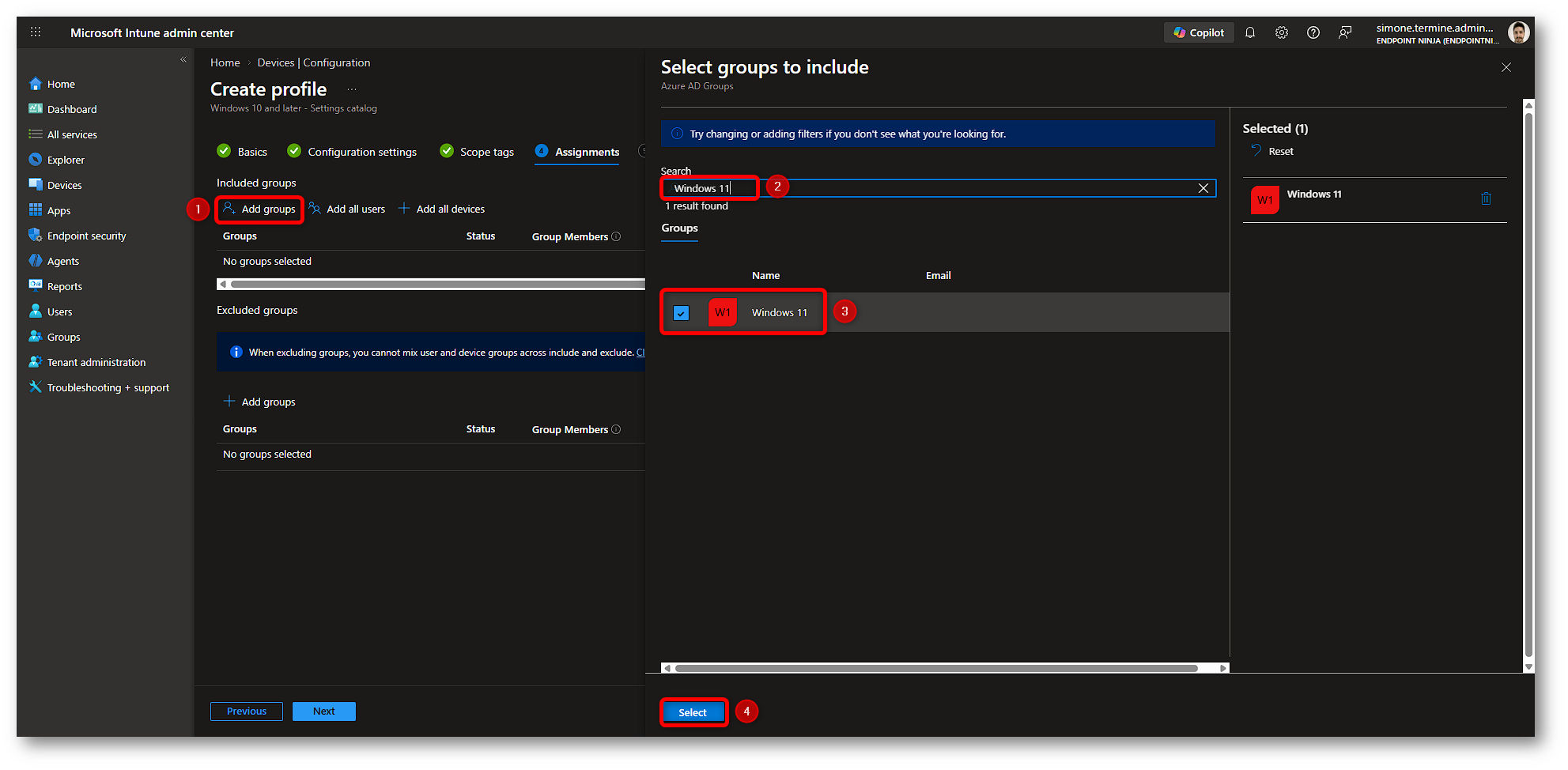 A questo punto, nella sezione Assignments, assegniamo la policy al gruppo desiderato. Come fatto in precedenza, per assegnare la policy a un gruppo specifico, clicchiamo su Add groups, cerchiamo il gruppo desiderato, selezioniamolo tramite la relativa checkbox e infine clicchiamo su Select.