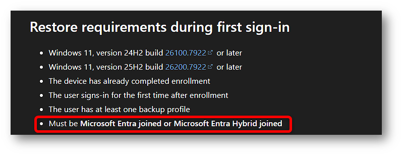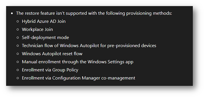 La pagina Windows Backup for Organizations in Microsoft Intune continua però a elencare, tra i Known issues, alcuni metodi di provisioning non supportati per il restore, tra cui Hybrid Azure AD Join, Workplace Join, Self-deployment mode, Technician flow of Windows Autopilot for pre-provisioned devices, Windows Autopilot reset flow, Manual enrollment through the Windows Settings app, Enrollment via Group Policy ed Enrollment via Configuration Manager co-management, invalidando in parte quanto riportato in precedenza.