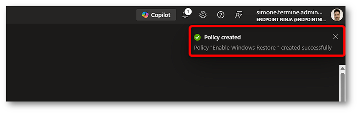 Dopo pochi istanti la policy per le impostazioni di Windows Restore sarà disponibile in Intune e pronta per la distribuzione secondo le assegnazioni configurate.