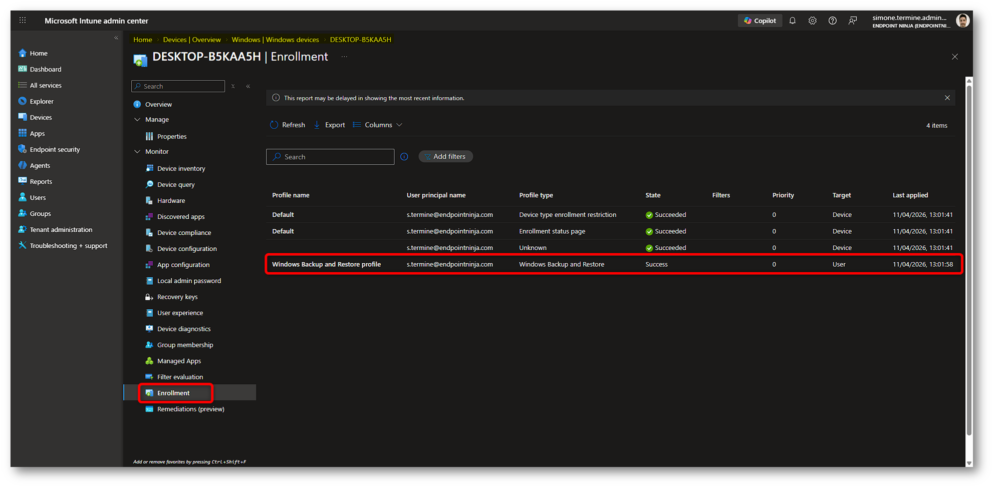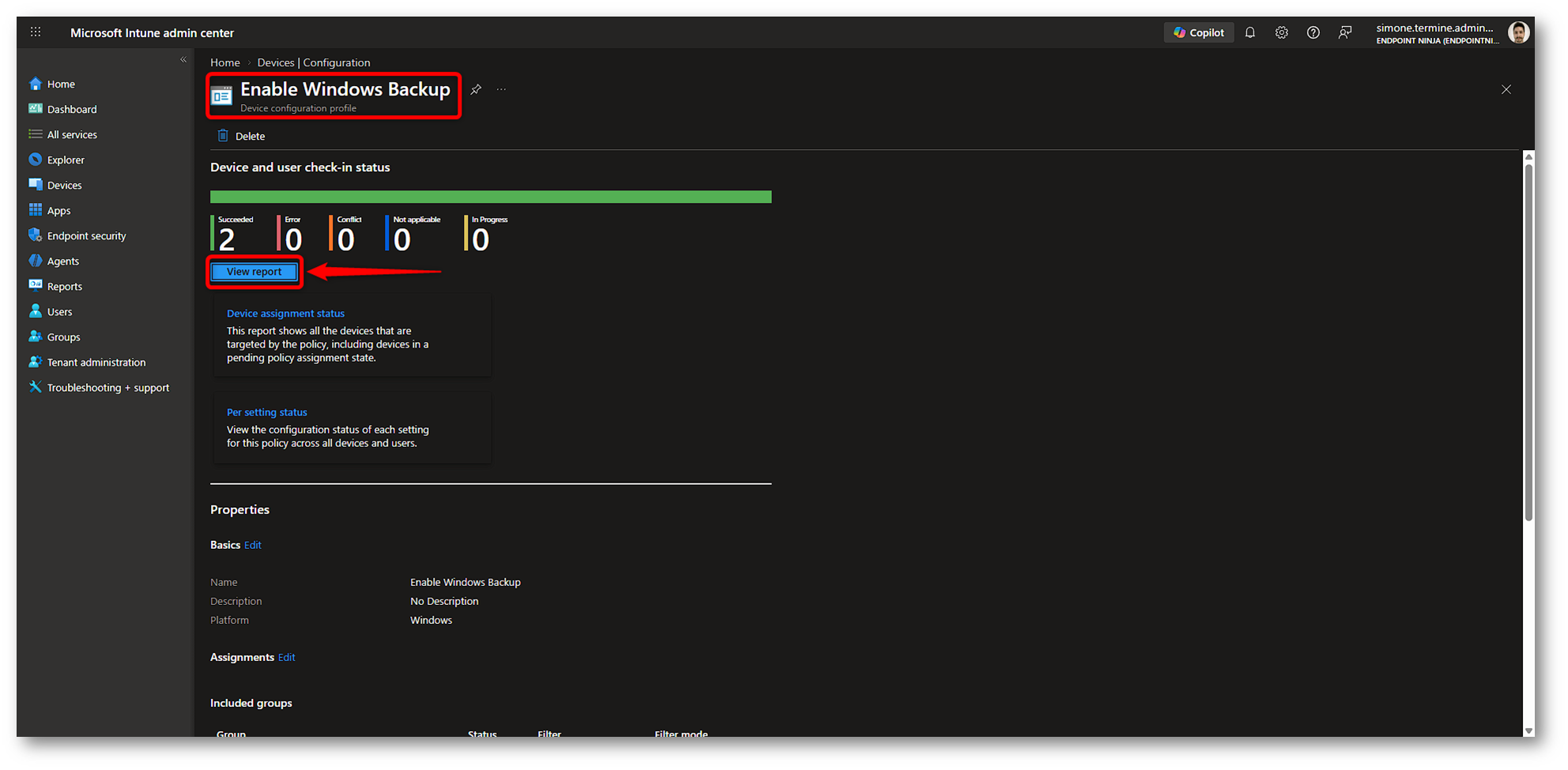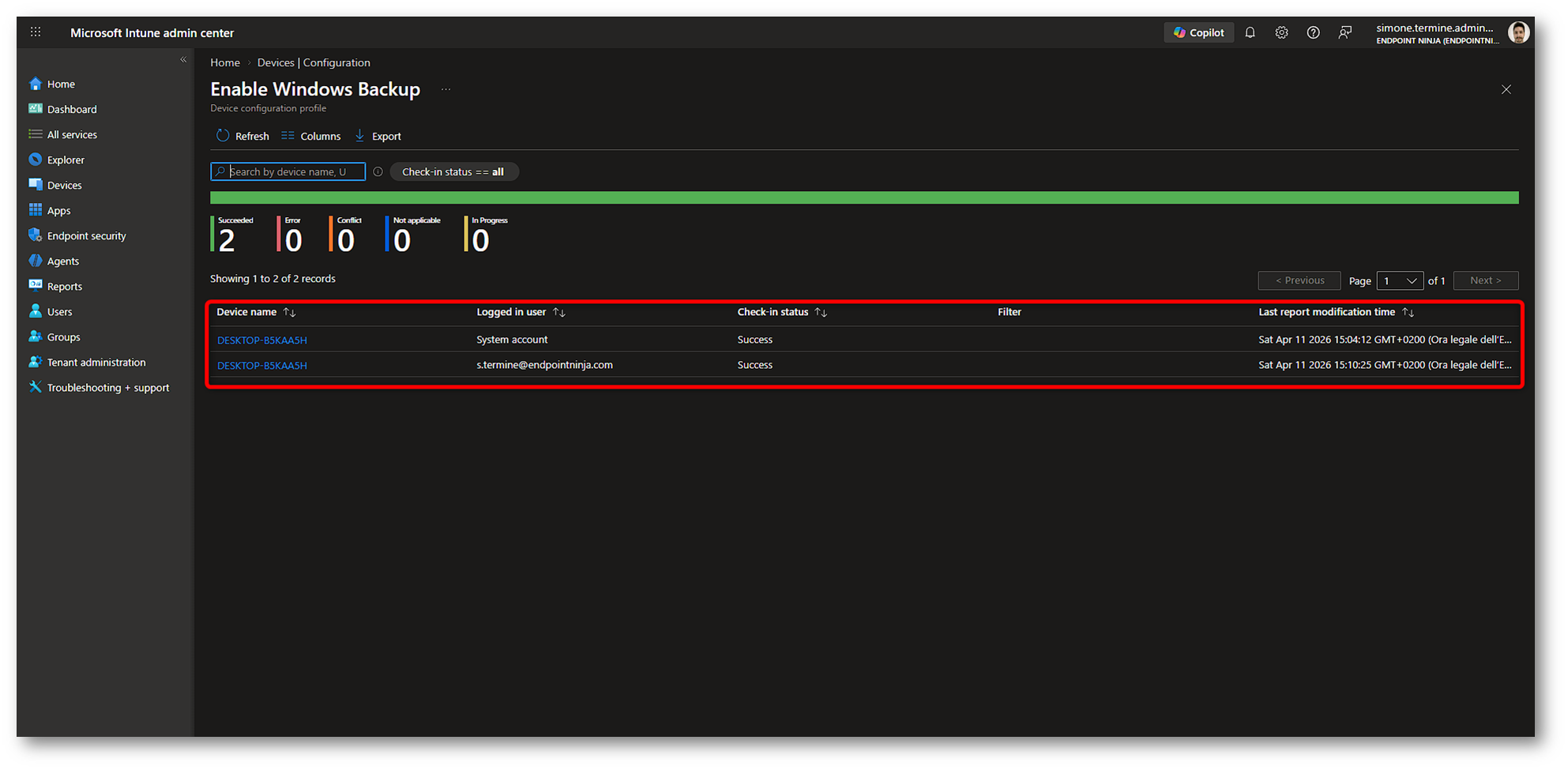Vediamo ora come controllare in Intune che le configurazioni siano state recepite correttamente. Anche in questo caso conviene separare i vari scenari, perché la logica di monitoraggio non è identica per backup e restore.