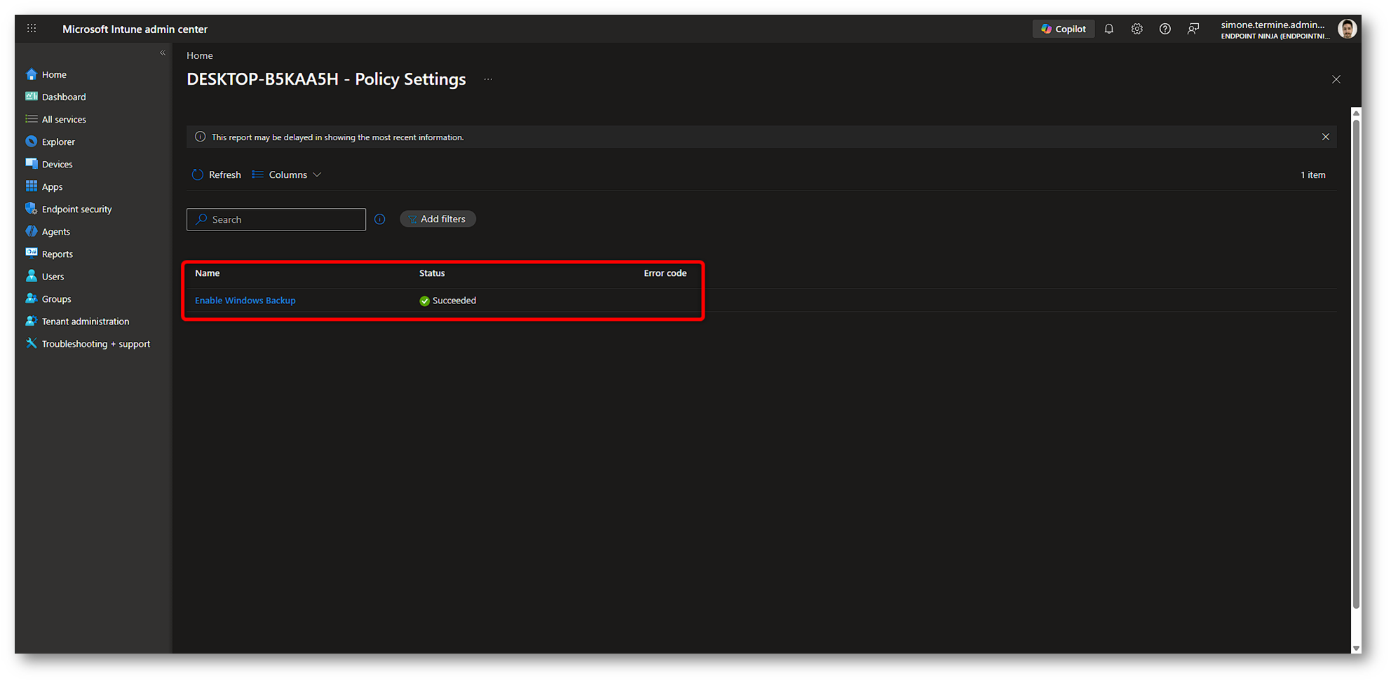 Figura 22: Monitoring policy Windows Backup in Microsoft Intune – Parte 1