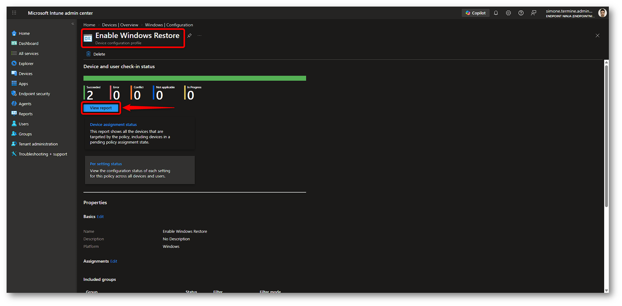 Figura 26: Monitoring policy Windows Restore post-enrollment in Microsoft Intune