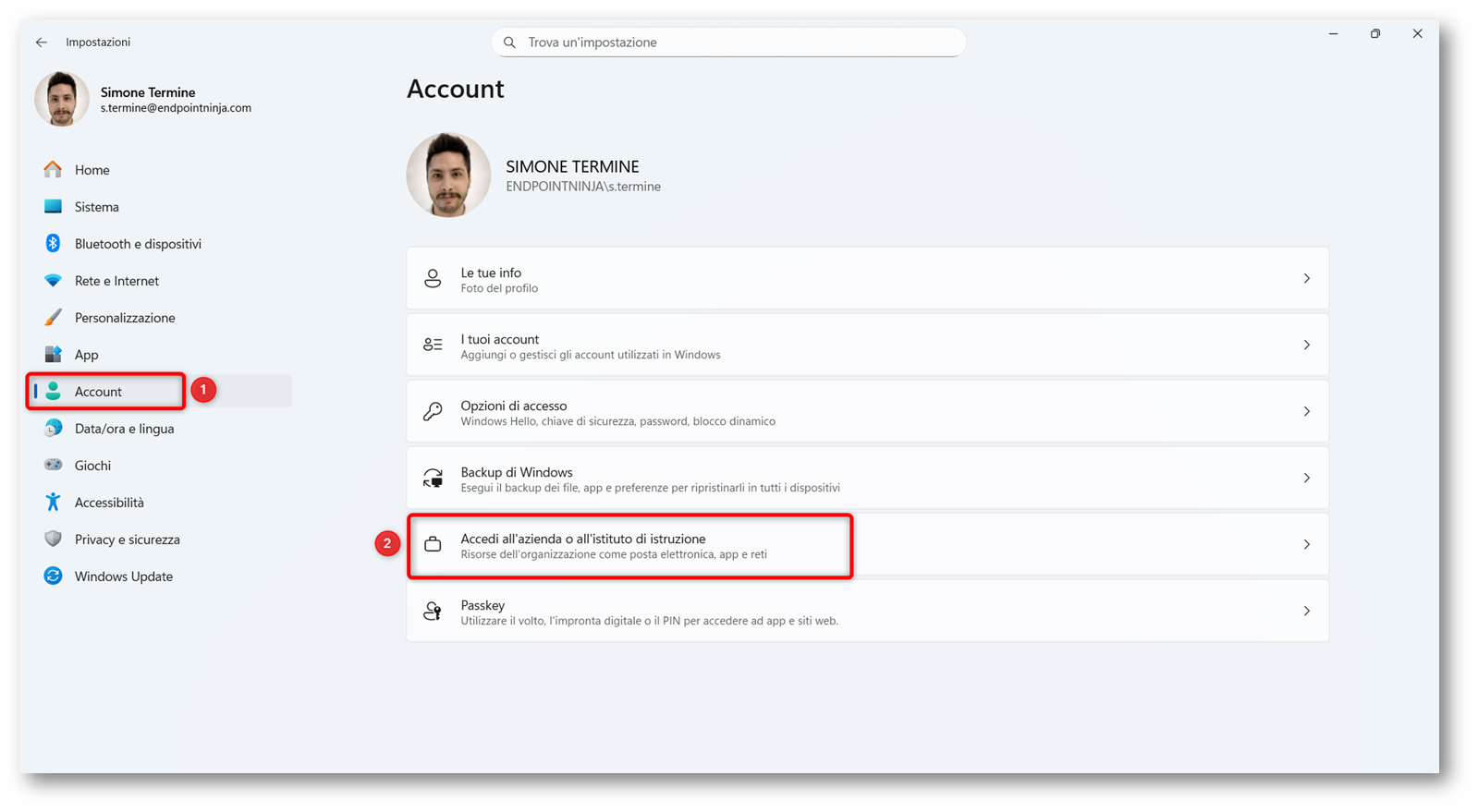 Quando però serve andare più a fondo, il riferimento migliore è il report diagnostico MDM del dispositivo. In questo scenario stiamo infatti lavorando con profili MDM, policy CSP e impostazioni di enrollment; quindi, il punto di partenza più centrato è proprio la creazione del report MDM. Per generarlo, apriamo le Impostazioni di Windows (ad esempio con Win + I) e andiamo in Account > Accesso all’azienda o all’istituto di istruzione.