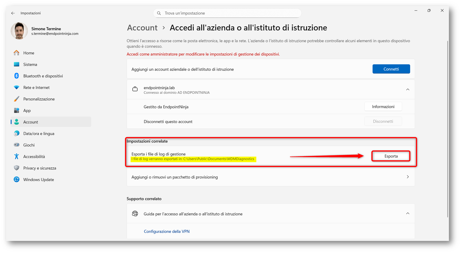 Nella pagina che si apre, dalla sezione Impostazioni correlate facciamo clic su Esporta per generare il report MDM. Come indicato nella schermata, i file verranno salvati nel percorso C:\Users\Public\Documents\MDMDiagnostics, cartella utile per analizzare lo stato delle configurazioni MDM ricevute dal dispositivo.