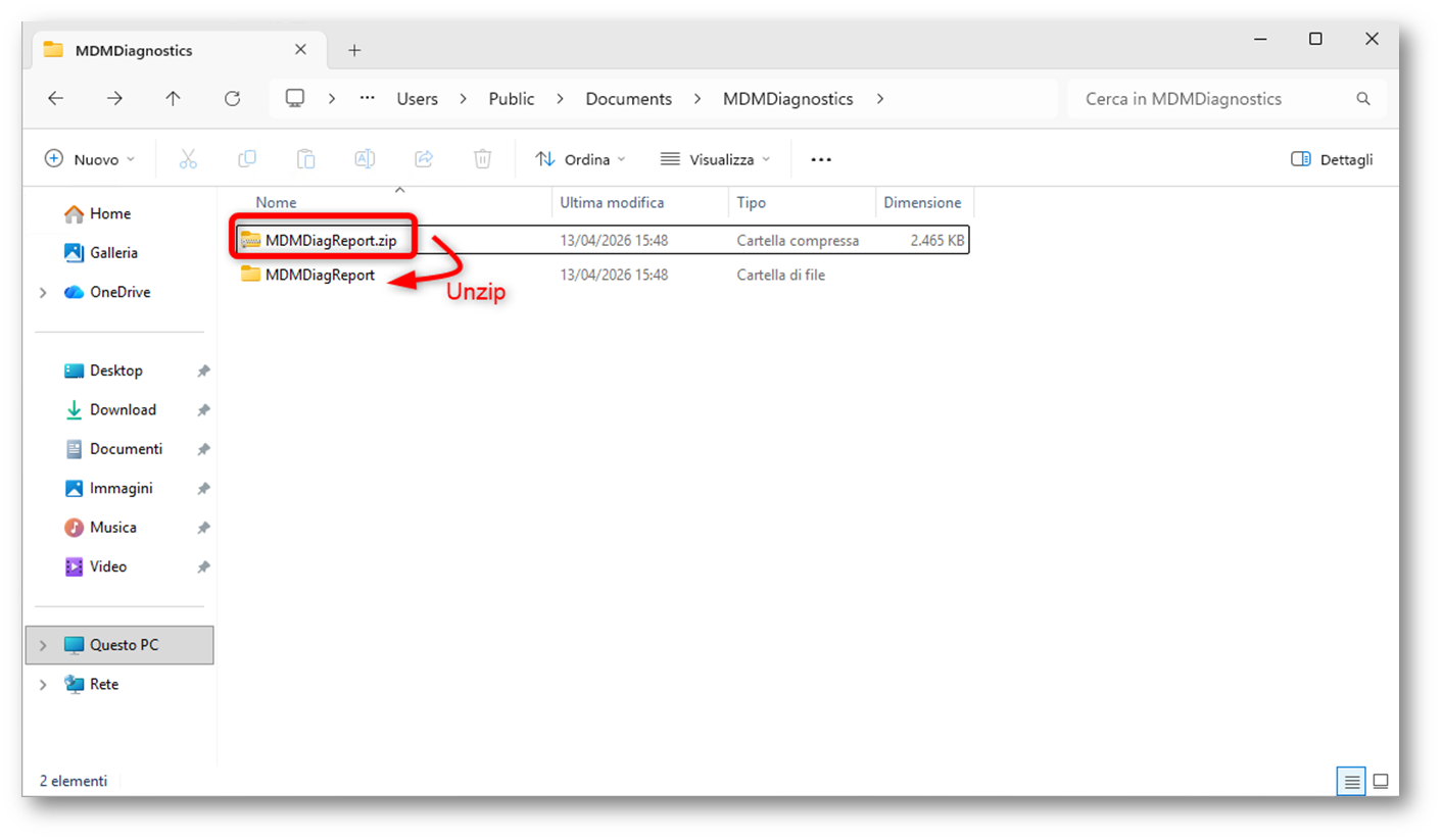Recandoci nel percorso C:\Users\Public\Documents\MDMDiagnostics, troviamo il file MDMDiagReport.zip. A questo punto possiamo estrarlo e aprire la cartella con il contenuto del report.