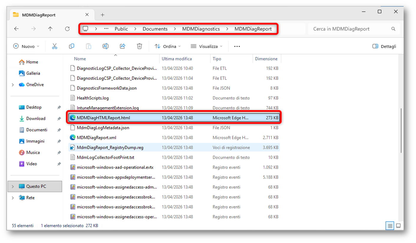 All’interno della cartella troviamo diversi file e log diagnostici raccolti dal sistema. Tra questi, uno dei più utili per una prima verifica è il report MDM in formato HTML, chiamato MDMDiagHTMLReport.html. Apriamolo.
