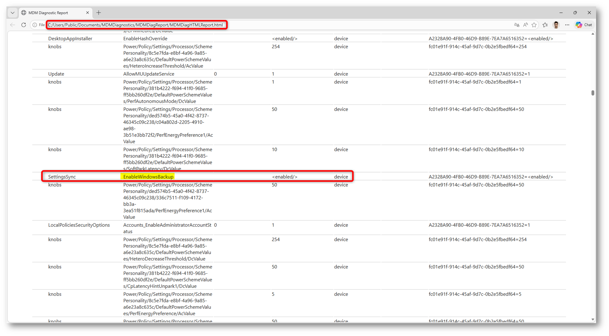 Una volta aperto il report, possiamo cercare il riferimento EnableWindowsBackup nell’area SettingsSync per verificare che il dispositivo abbia ricevuto correttamente la configurazione distribuita tramite Intune. Se vogliamo scendere più nel dettaglio, possiamo cercare anche le singole impostazioni di Windows Backup o Windows Restore per controllare quali valori siano stati recepiti dal sistema. Questo passaggio è particolarmente utile perché il report MDM permette di visualizzare lo stato delle configurazioni applicate al dispositivo, comprese policy, certificati, sorgenti di configurazione e, quando presenti, anche eventuali impostazioni di Group Policy bloccate dalla presenza di un equivalente MDM già applicato.