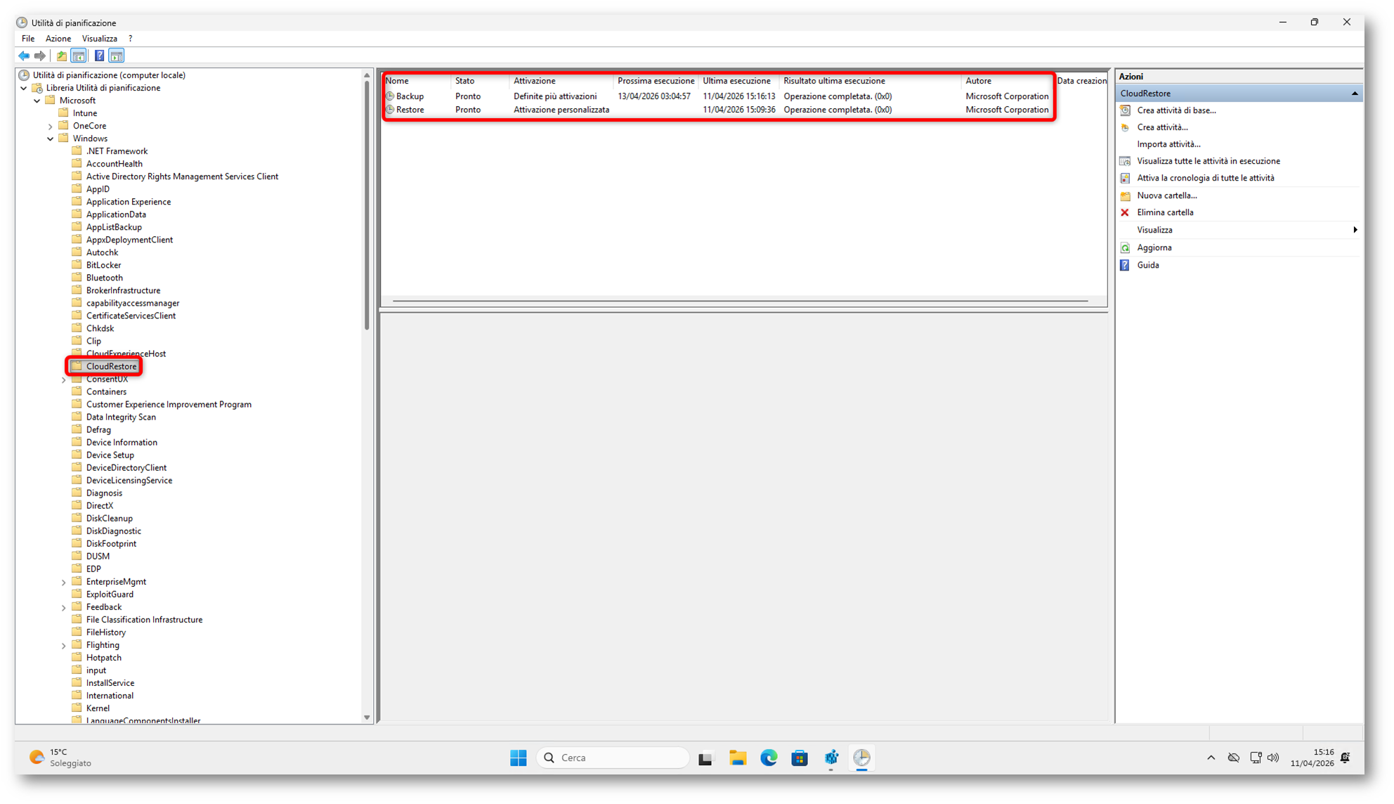 Quello che segue, invece, non deriva dalla documentazione ufficiale Microsoft ma da osservazioni effettuate sul client durante i test. Nei sistemi analizzati ho osservato la presenza di attività pianificate sotto il percorso Microsoft > Windows > CloudRestore. In particolare, quando Windows Backup è abilitato, viene abilitato il task Backup; quando viene configurato anche Windows Restore, è possibile osservare che anche il task Restore è abilitato. Sempre nei test di laboratorio, durante l’esecuzione dell’attività Backup, ho rilevato la scrittura del valore LastFullBackupCompletedTime al percorso HKCU\Software\Microsoft\Windows\CurrentVersion\CloudStore\SystemMetaData.
