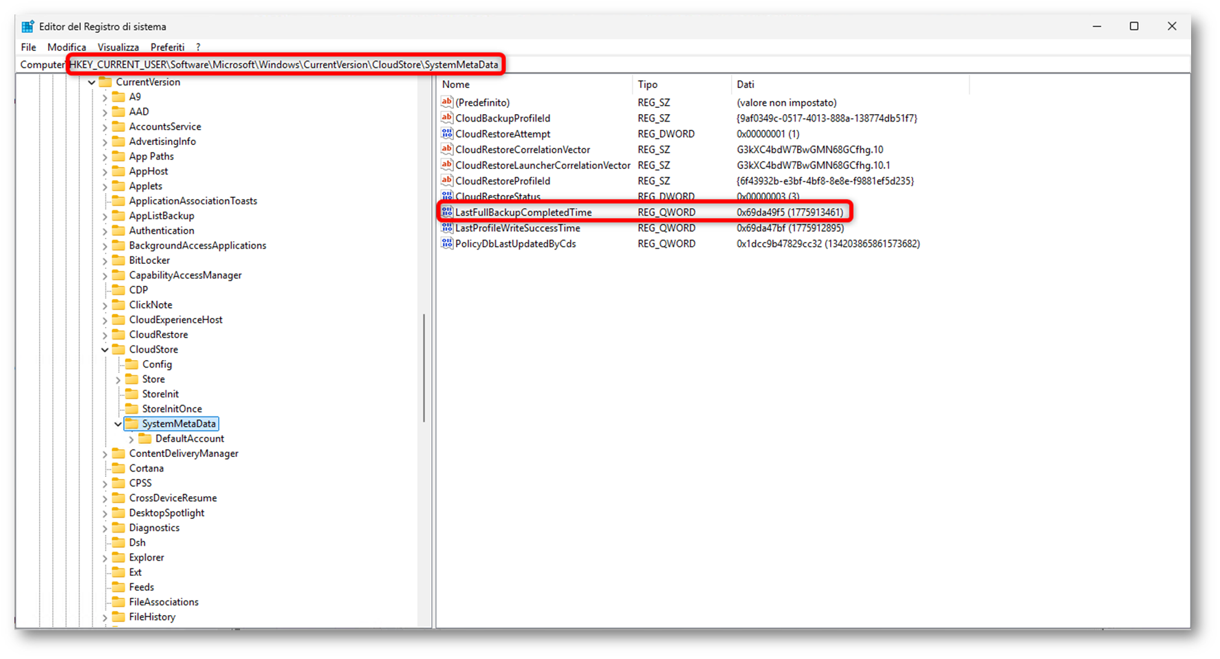 Tra i controlli che, nei miei test di laboratorio, si sono rivelati utili lato client, c’è anche il registro di sistema. Quando la policy viene recepita correttamente dal dispositivo e il task Backup entra in esecuzione, è possibile osservare la presenza di informazioni sotto il percorso HKEY_CURRENT_USER\Software\Microsoft\Windows\CurrentVersion\CloudStore. Nell’immagine che segue, ad esempio, vediamo il valore LastFullBackupCompletedTime al percorso HKEY_CURRENT_USER\Software\Microsoft\Windows\CurrentVersion\CloudStore\SystemMetaData. Questo riscontro, nei test, si è rivelato utile per verificare se sul profilo utente esiste traccia di un backup completato.
