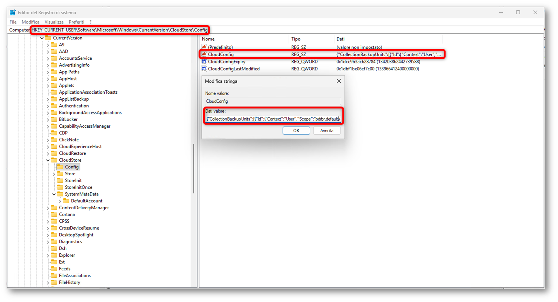 Un altro elemento interessante che ho riscontrato è il valore CloudConfig, presente al percorso HKEY_CURRENT_USER\Software\Microsoft\Windows\CurrentVersion\CloudStore\Config. La sua lettura può aiutare a capire quali categorie di configurazione il client sta considerando nel contesto di Windows Backup.