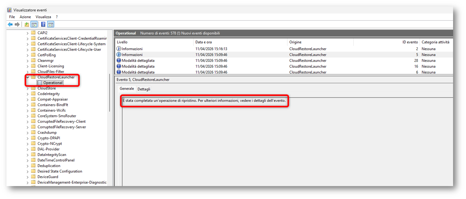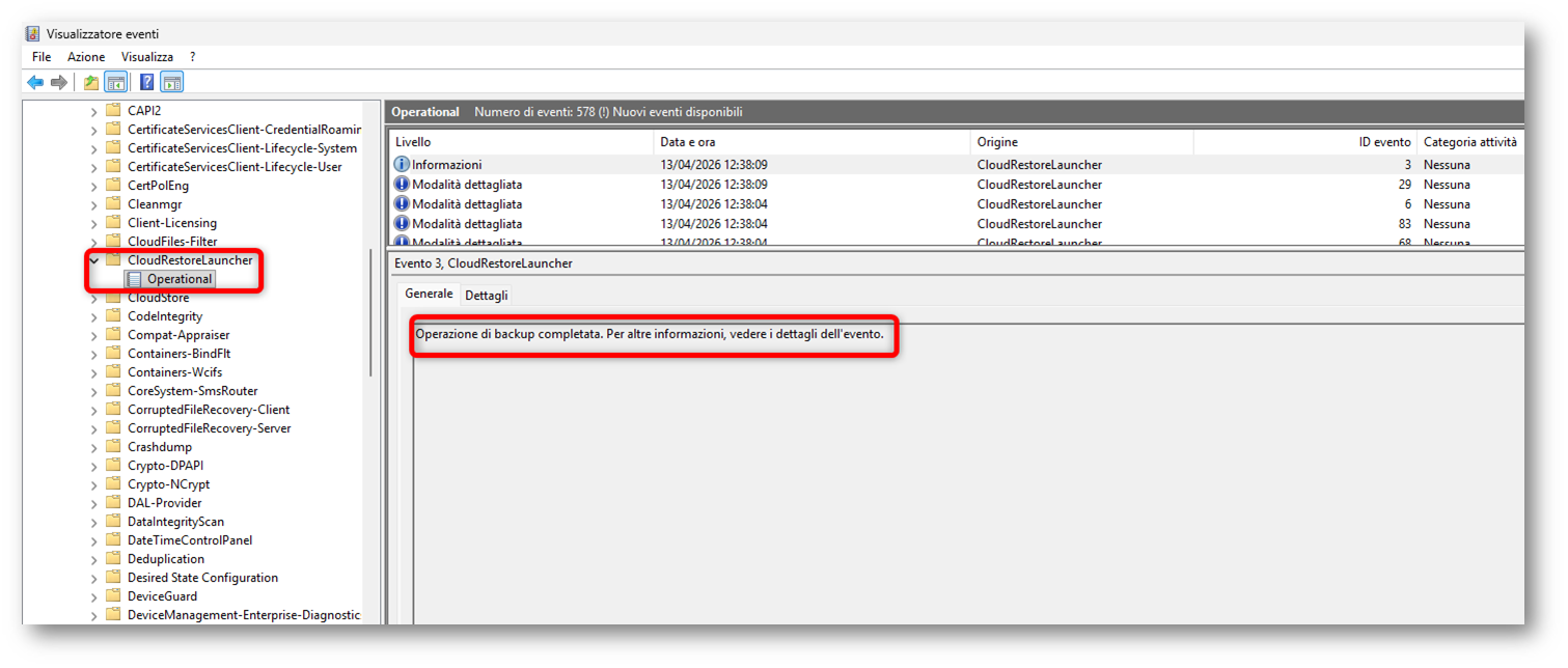 Un altro controllo utile lato client, soprattutto quando il comportamento non è quello atteso, è l’Event Viewer. Microsoft documenta il funzionamento generale di Windows Backup for Organizations, la distinzione tra backup e restore e il fatto che il backup venga eseguito automaticamente a intervalli regolari, ma non entra nel dettaglio dei canali evento da consultare durante il troubleshooting. Tuttavia, ho rilevato che le attività legate a CloudRestore vengono registrate nel canale eventi Registri applicazioni e servizi > Microsoft > Windows > Microsoft-Windows-CloudRestoreLauncher > Operational. Questo log può essere utile per individuare informazioni, warning ed errori relativi sia al flusso di Windows Backup sia al flusso di Windows Restore.