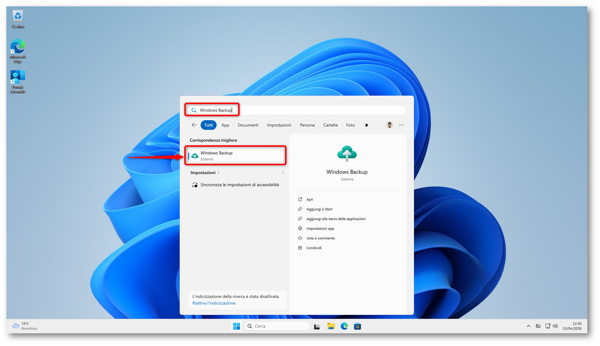 Figura 37: Ricerca applicazione Windows Backup in Windows 11