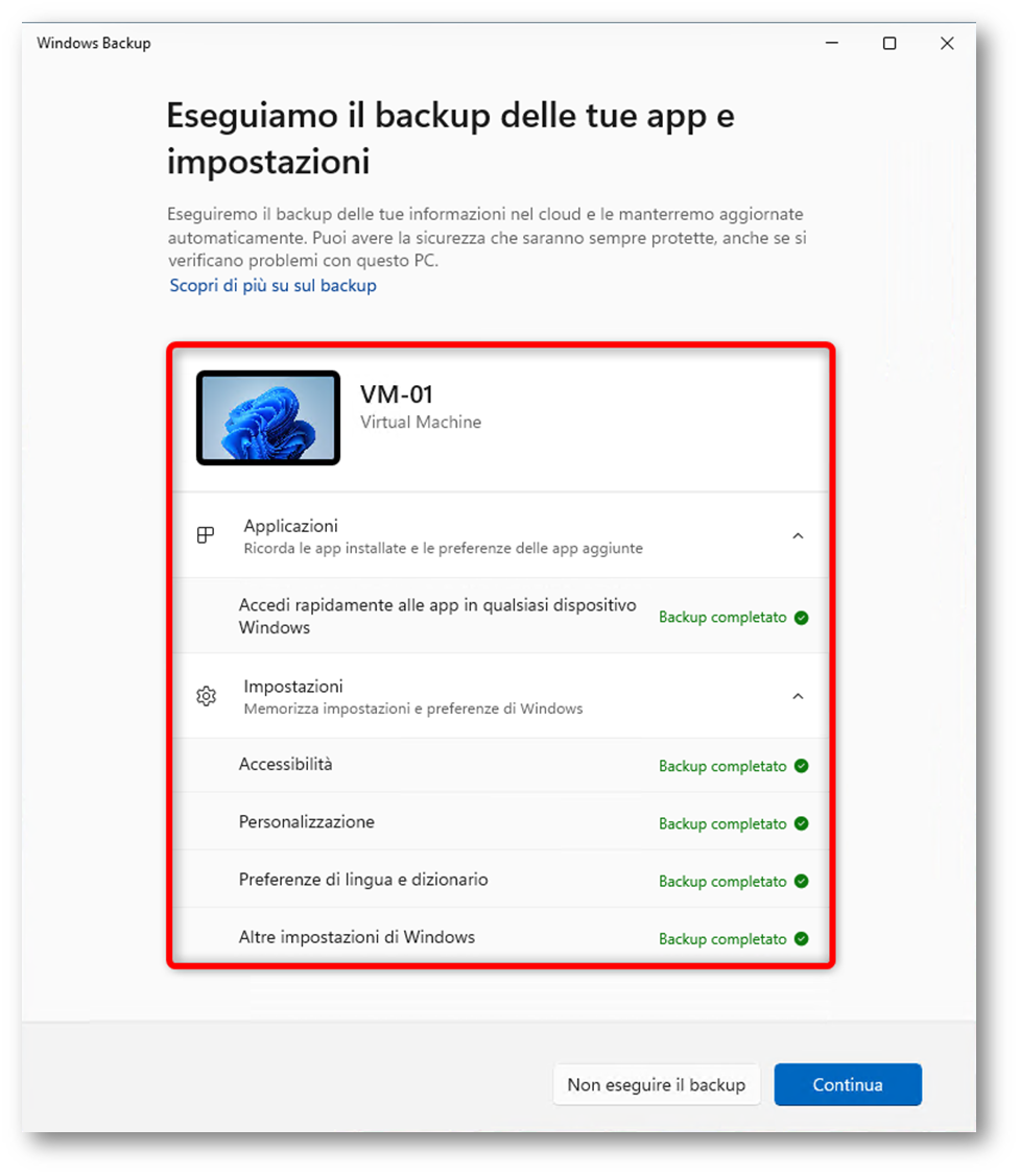Facendo clic su Continua, viene avviato un backup manuale delle impostazioni e delle informazioni supportate dalla funzionalità. Questo passaggio è utile anche in fase di test, perché consente di forzare subito un salvataggio senza dover attendere il ciclo automatico previsto dalla feature.
