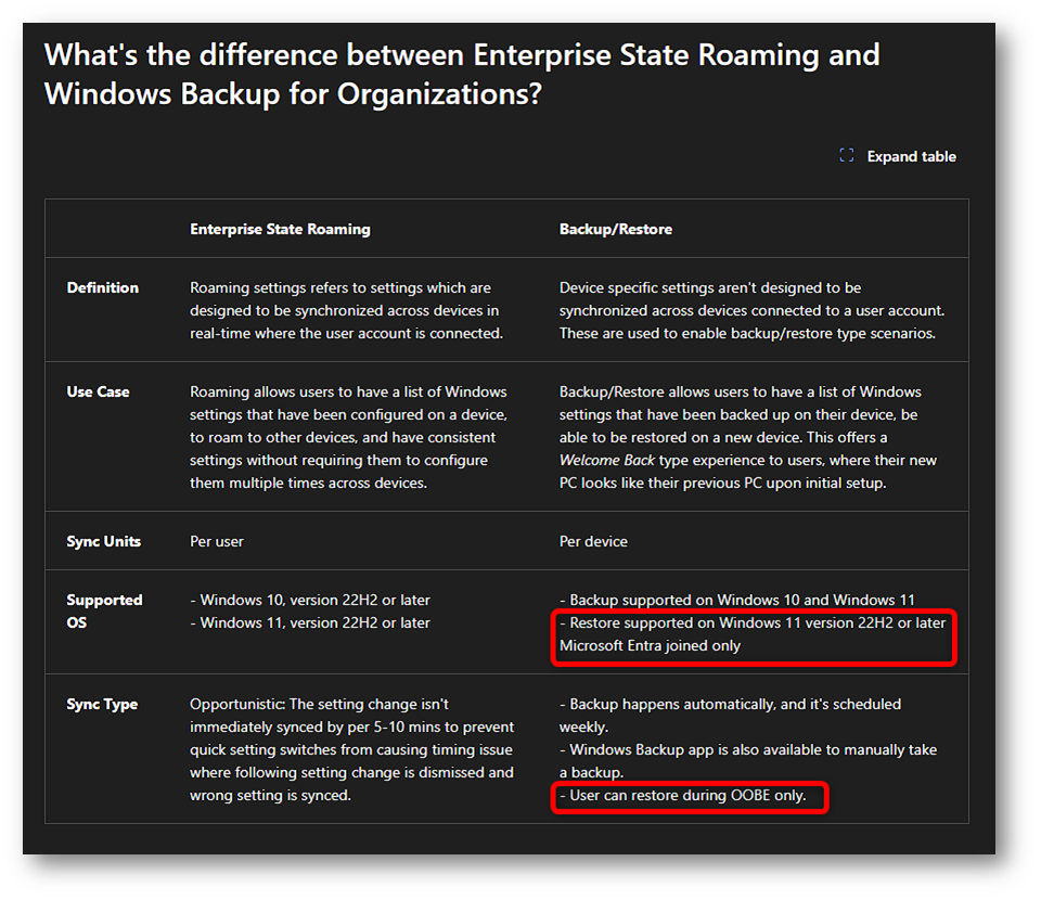 Entrando più nel dettaglio, la differenza sostanziale tra le due funzionalità è quindi questa: Enterprise State Roaming nasce per mantenere allineate tra più pc le impostazioni supportate dell’utente, con una logica di sincronizzazione per utente e di tipo opportunistico (ogni 5-10 minuti); Windows Backup for Organizations, invece, nasce per scenari di backup e restore, con una logica per dispositivo, così da permettere all’utente di ritrovare su un nuovo pc una parte dell’esperienza precedente durante un refresh hardware, una reinstallazione o una nuova distribuzione del device. ESR è infatti una feature di roaming settings, mentre Windows Backup for Organizations è una feature di backup/restore pensata per una esperienza di tipo welcome back.