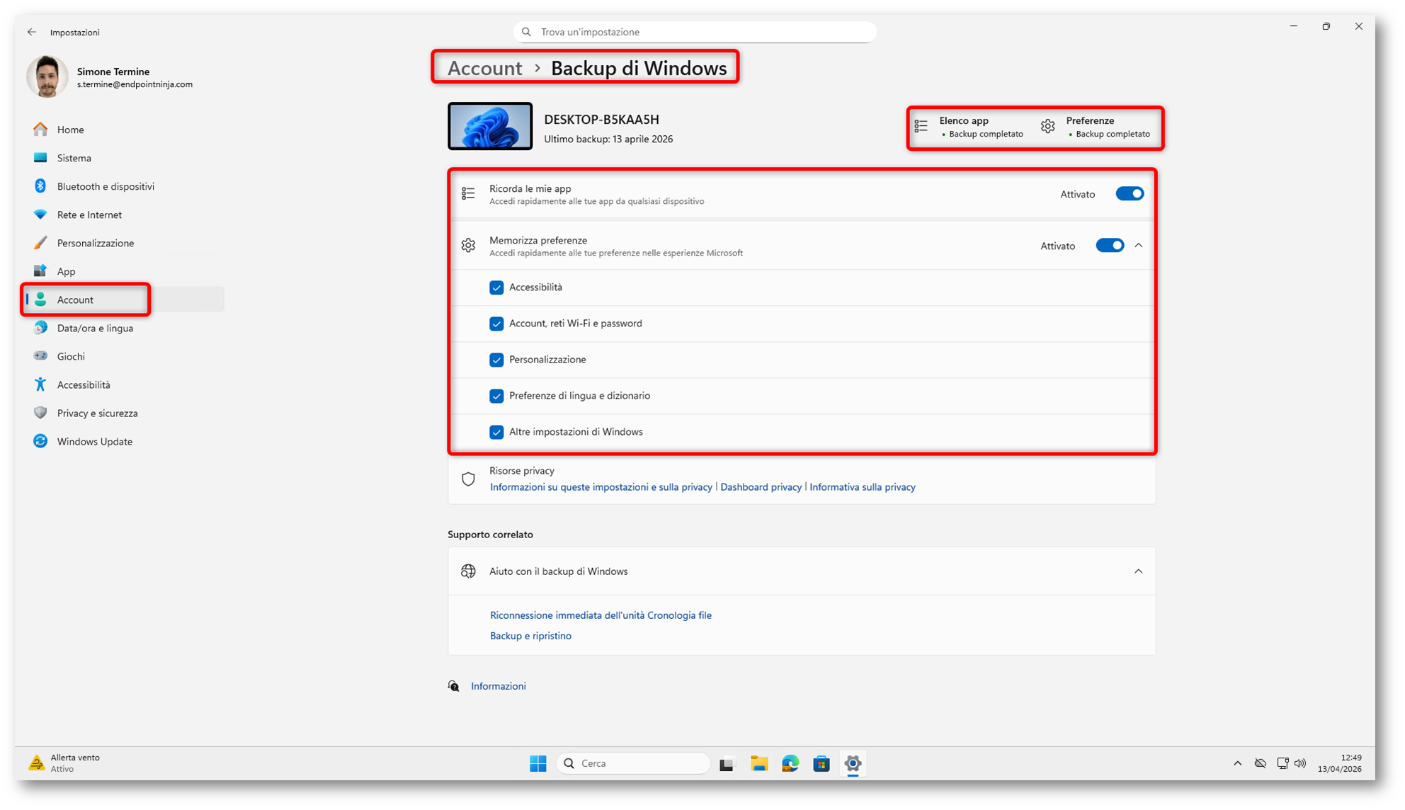 Per verificare più nel dettaglio ciò che rientra nell’esperienza di backup lato utente, è possibile anche andare in Impostazioni > Account > Backup di Windows. Da questa pagina vengono esposte le opzioni dedicate al salvataggio delle preferenze e delle app, cioè le due aree principali che Microsoft collega all’esperienza di Windows Backup. Ricordo un punto importante: questo non significa che vengano salvate tutte le impostazioni del sistema, ma solo quelle che rientrano nel perimetro supportato dalla funzionalità e dalle relative policy di backup.