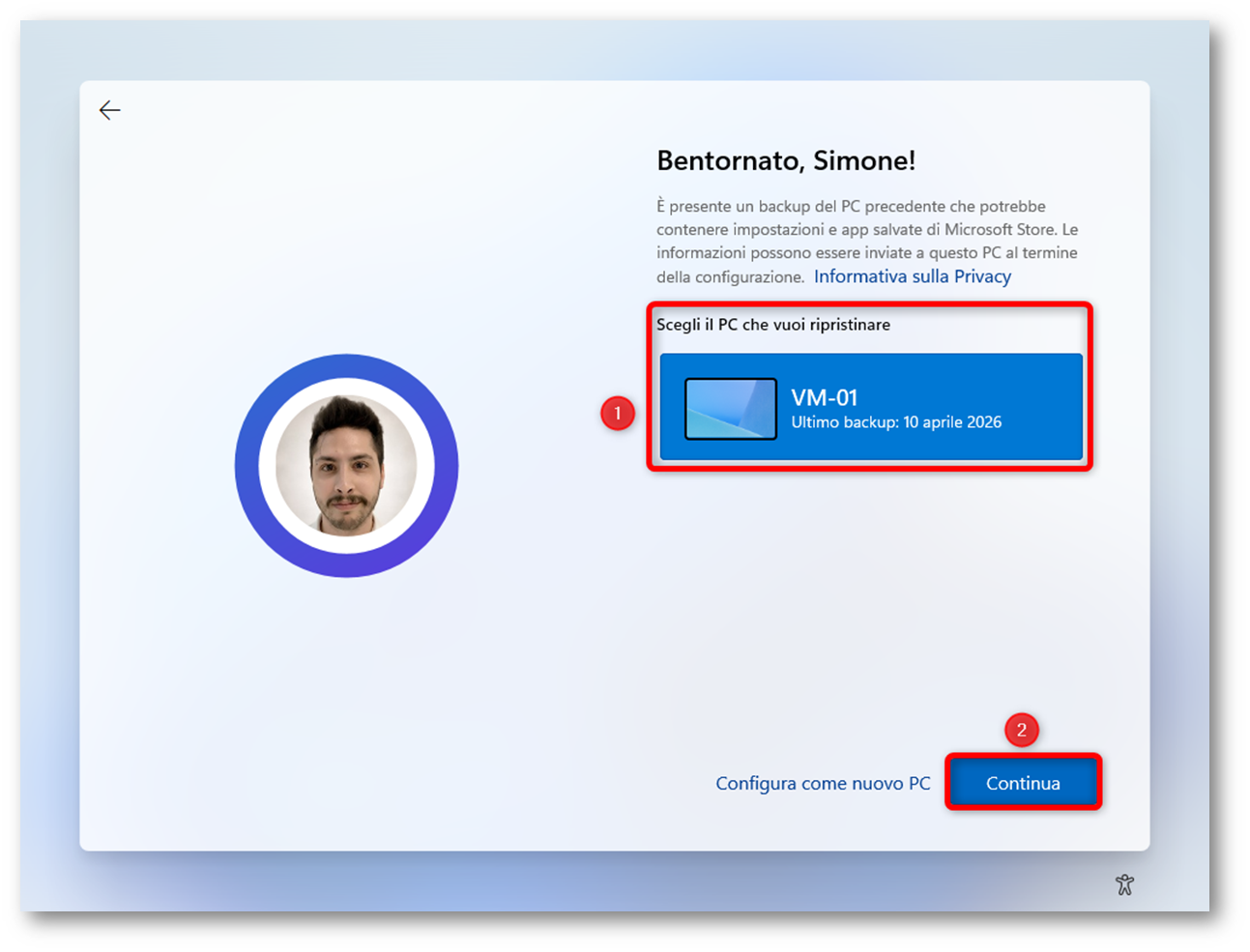 Se invece si seleziona Altre opzioni, viene aperta una schermata aggiuntiva da cui è possibile scegliere la voce Configura come nuovo PC oppure, in alternativa, tornare a selezionare uno dei backup disponibili e procedere comunque con il ripristino tramite il button Continua. Questo passaggio chiarisce meglio il fatto che il restore non è obbligatorio; infatti, l’utente può sempre decidere di non recuperare un profilo precedente e configurare il dispositivo da zero.