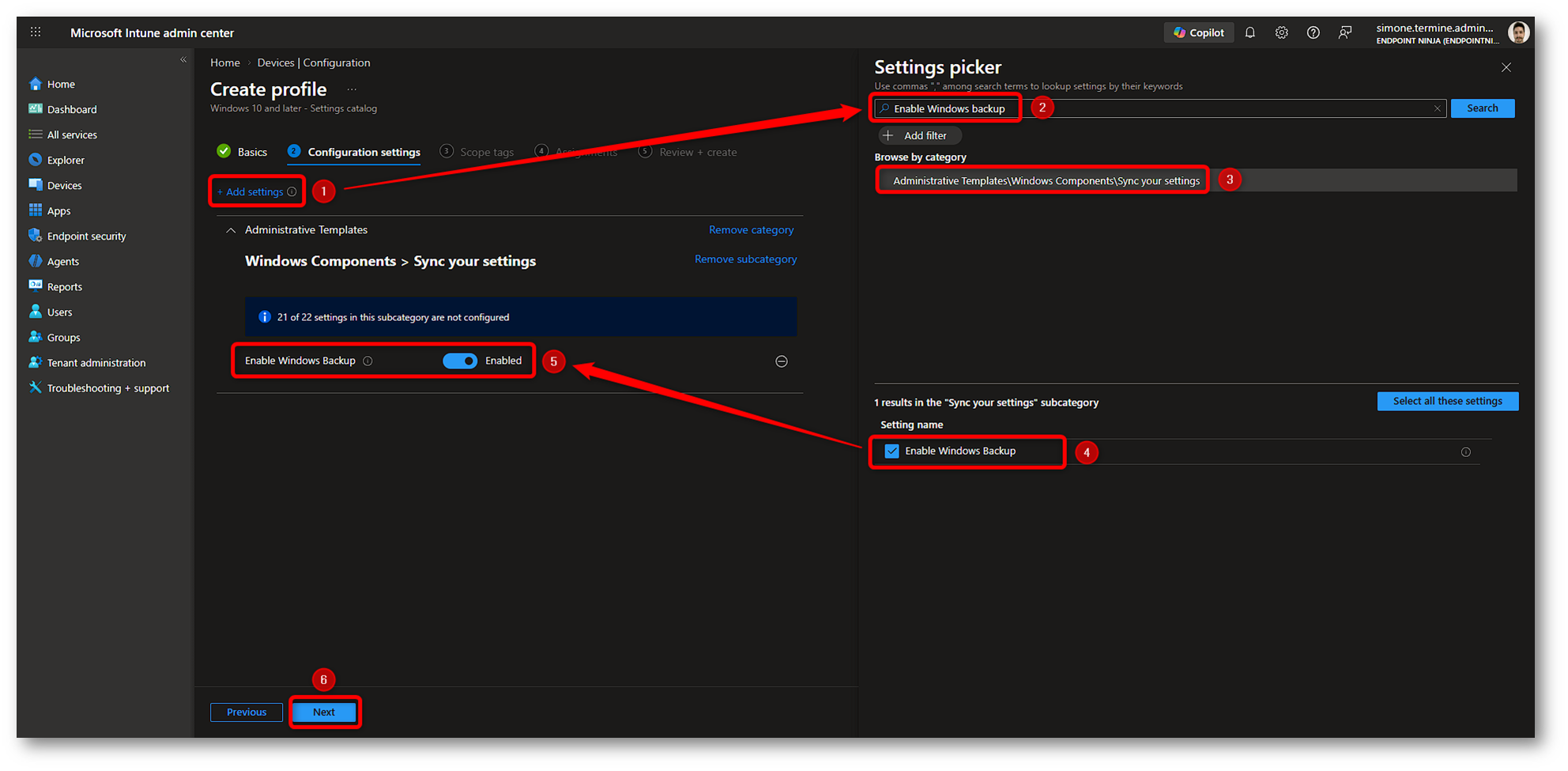 Figura 10: Creazione policy Windows Backup in Microsoft Intune – Parte 6