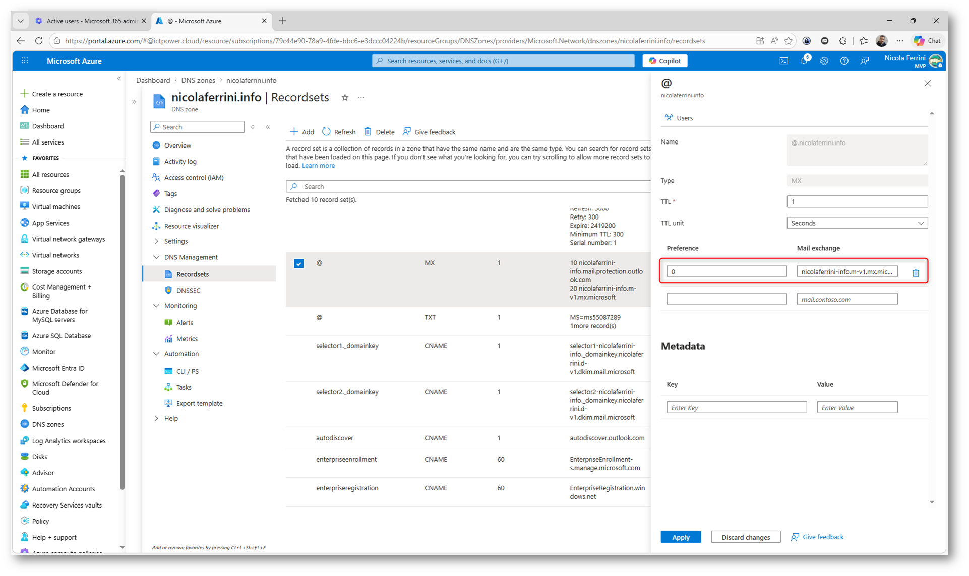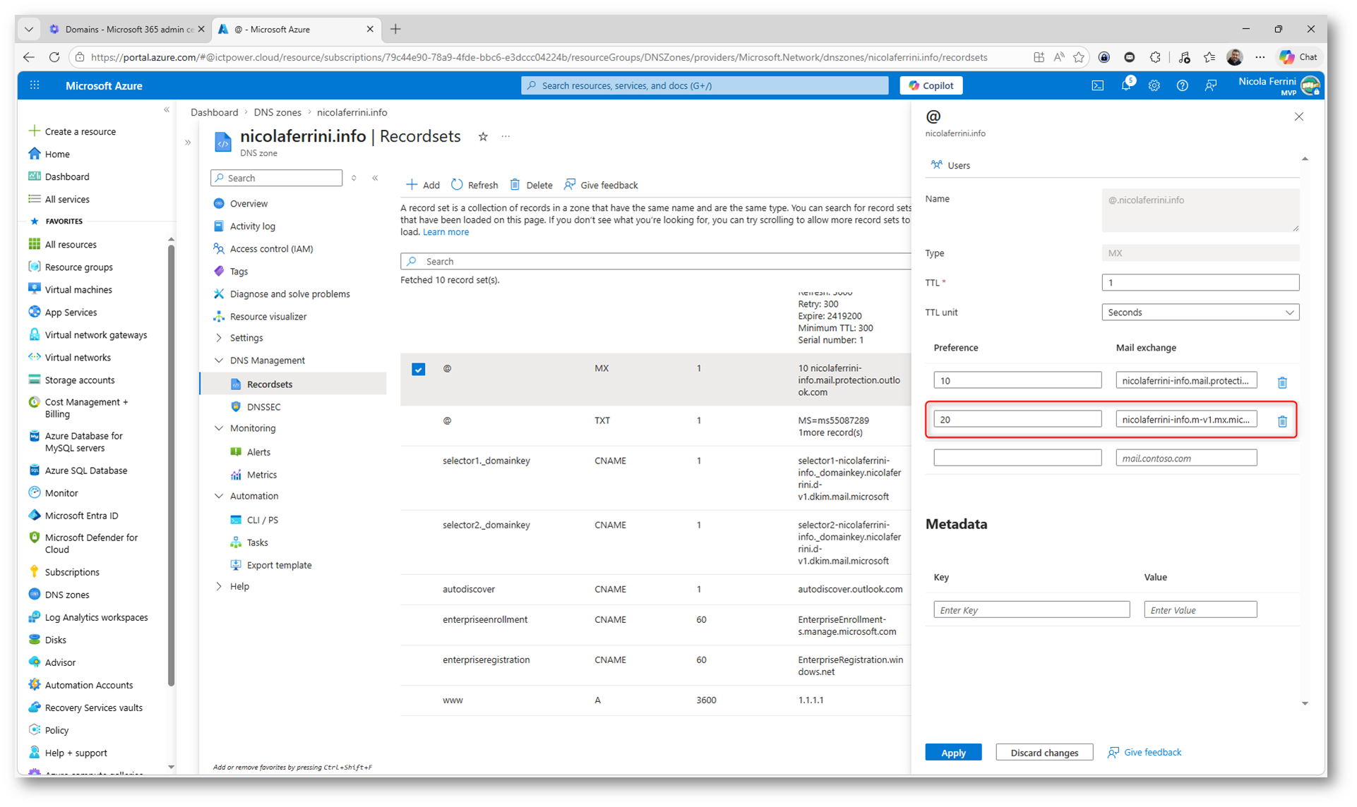Il passo successivo consiste nell’aggiornare il TTL del record MX esistente direttamente nel vostro Azure DNS (o registrar DNS). Dovete modificare il record MX abbassando il valore di TTL (Time To Live) al minimo consentito, come mostrato nella figura sotto, e verificare che la priorità sia correttamente impostata, tipicamente 0 o 10 per Exchange Online.