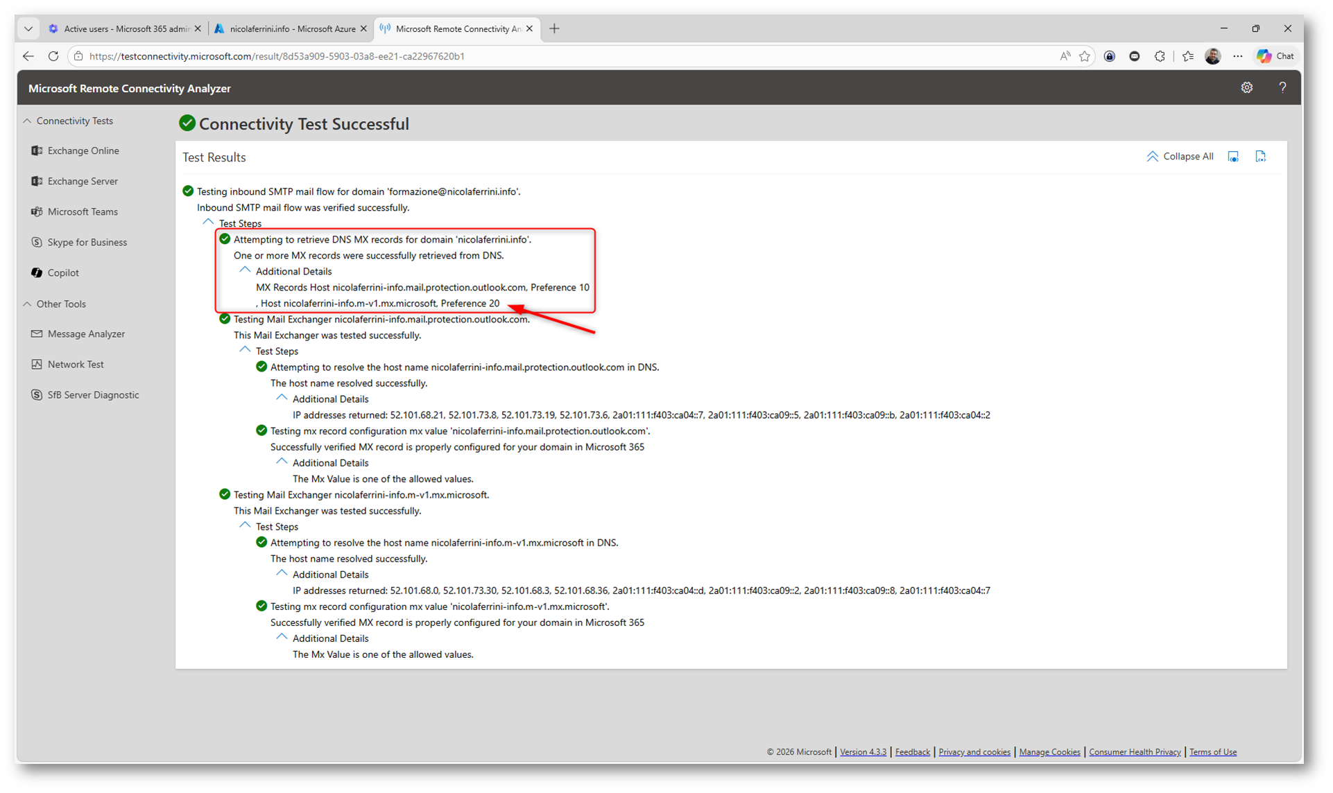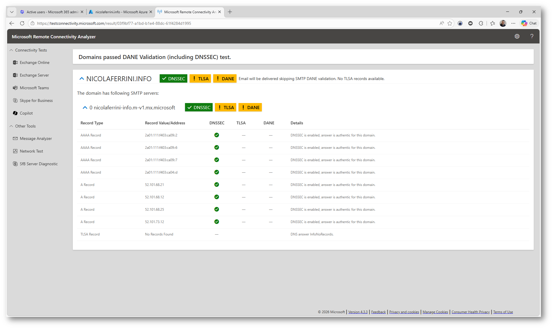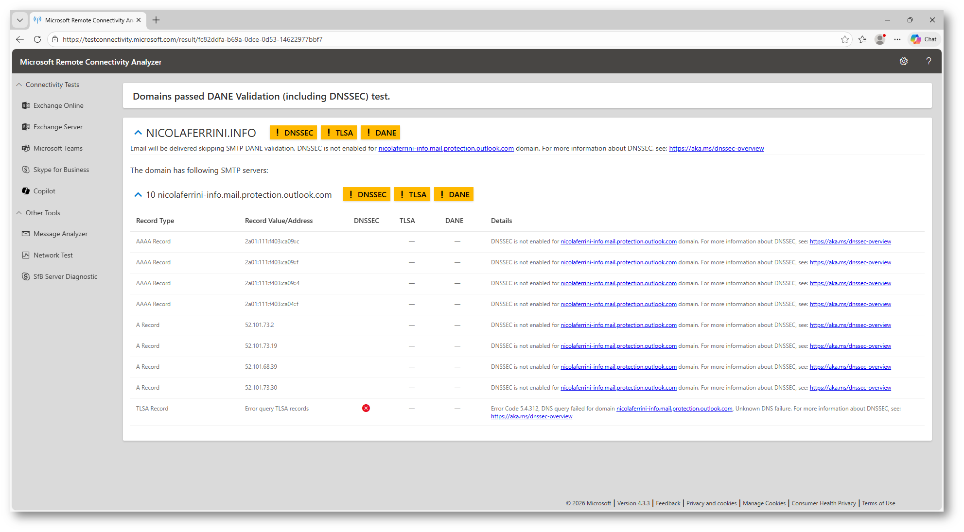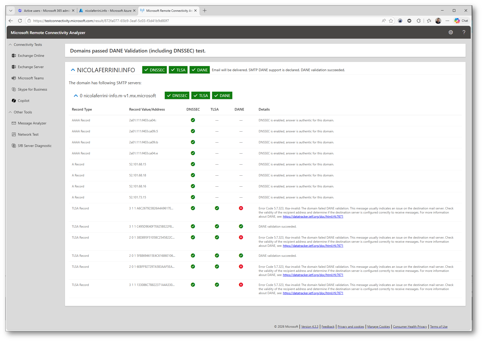 È importante notare un aspetto spesso frainteso: Exchange Online pubblica più record TLSA per garantire maggiore affidabilità e resilienza. Di conseguenza, è normale che alcuni record TLSA possano risultare non validi durante il test.