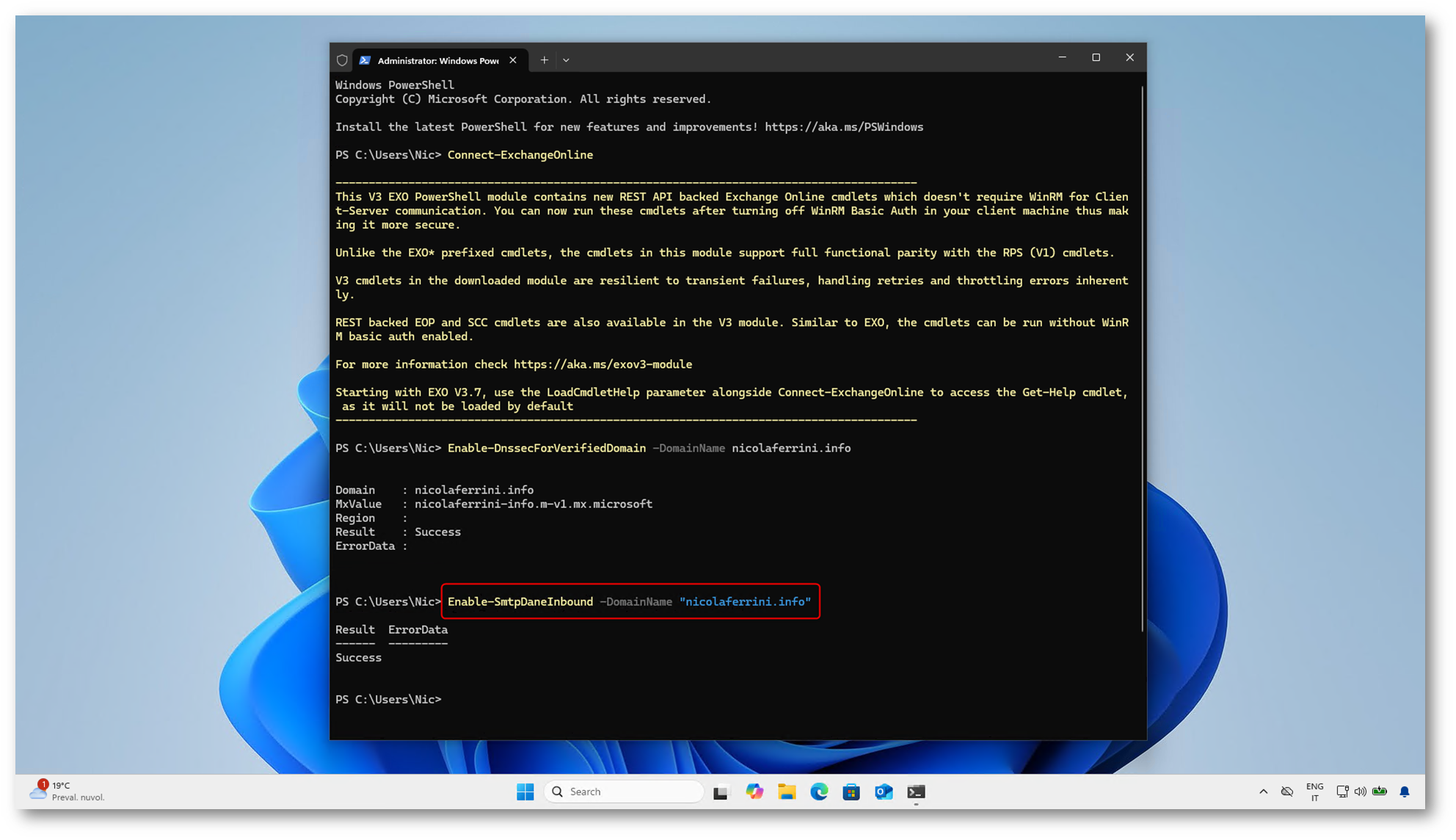 Figura 7: Esecuzione del cmdlet Enable-DnssecForVerifiedDomain per ottenere il nuovo endpoint MX compatibile con DNSSEC e DANE