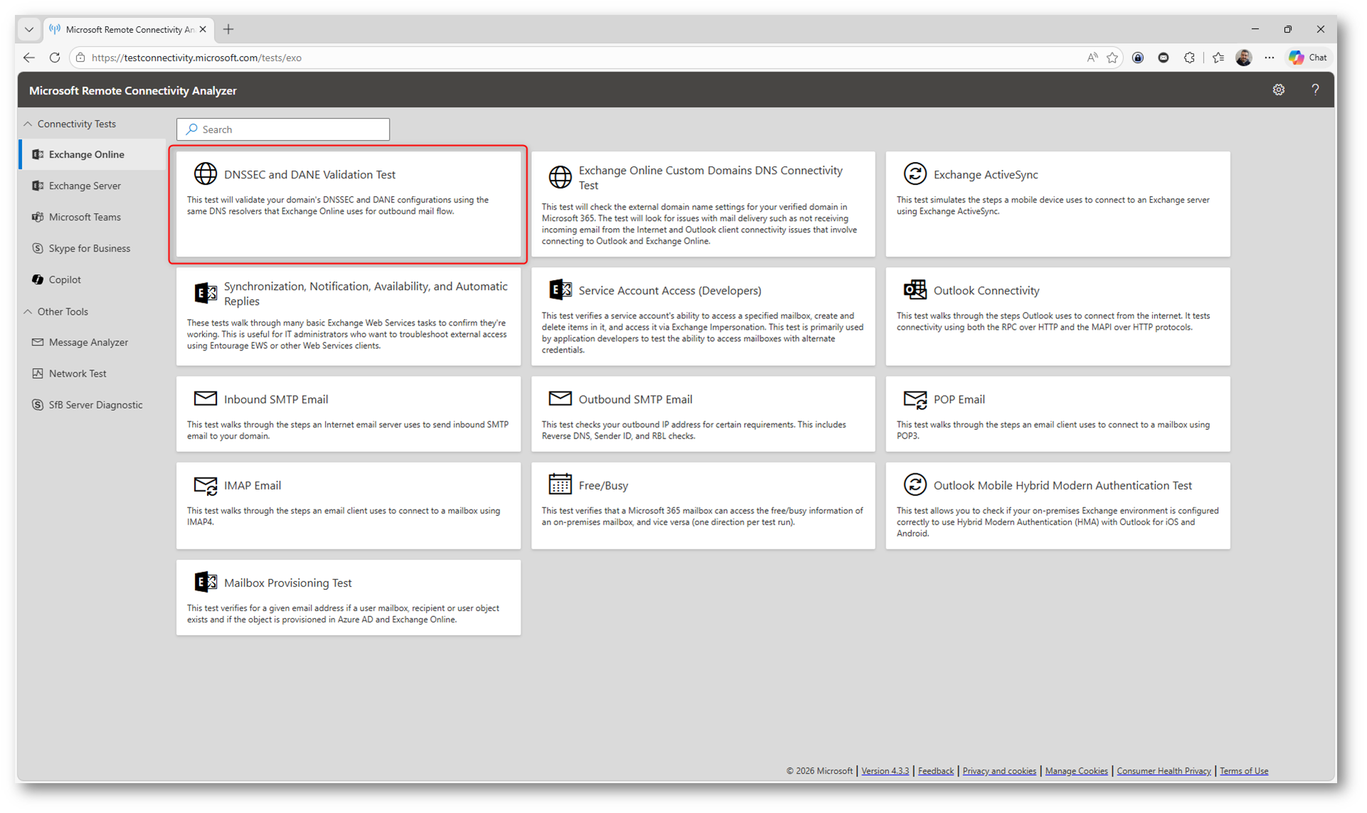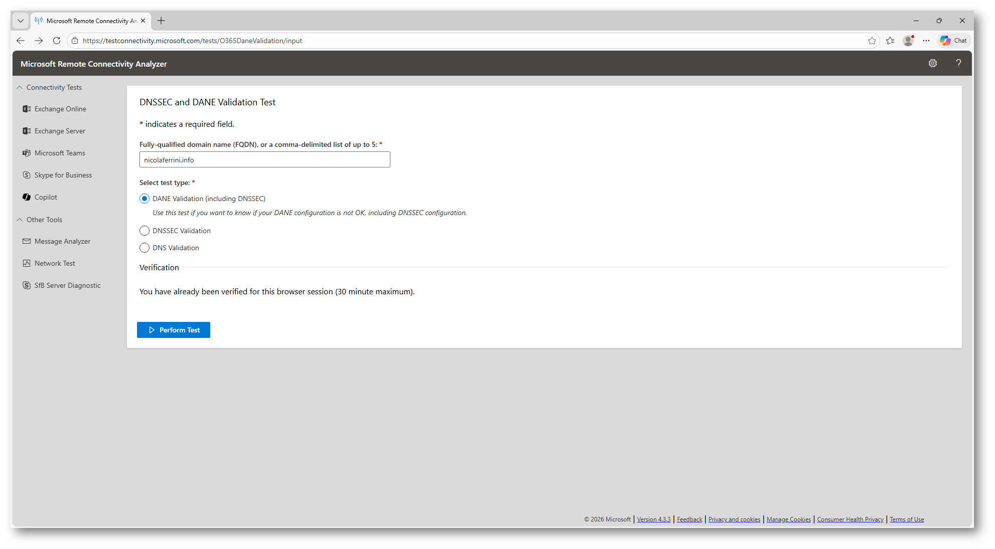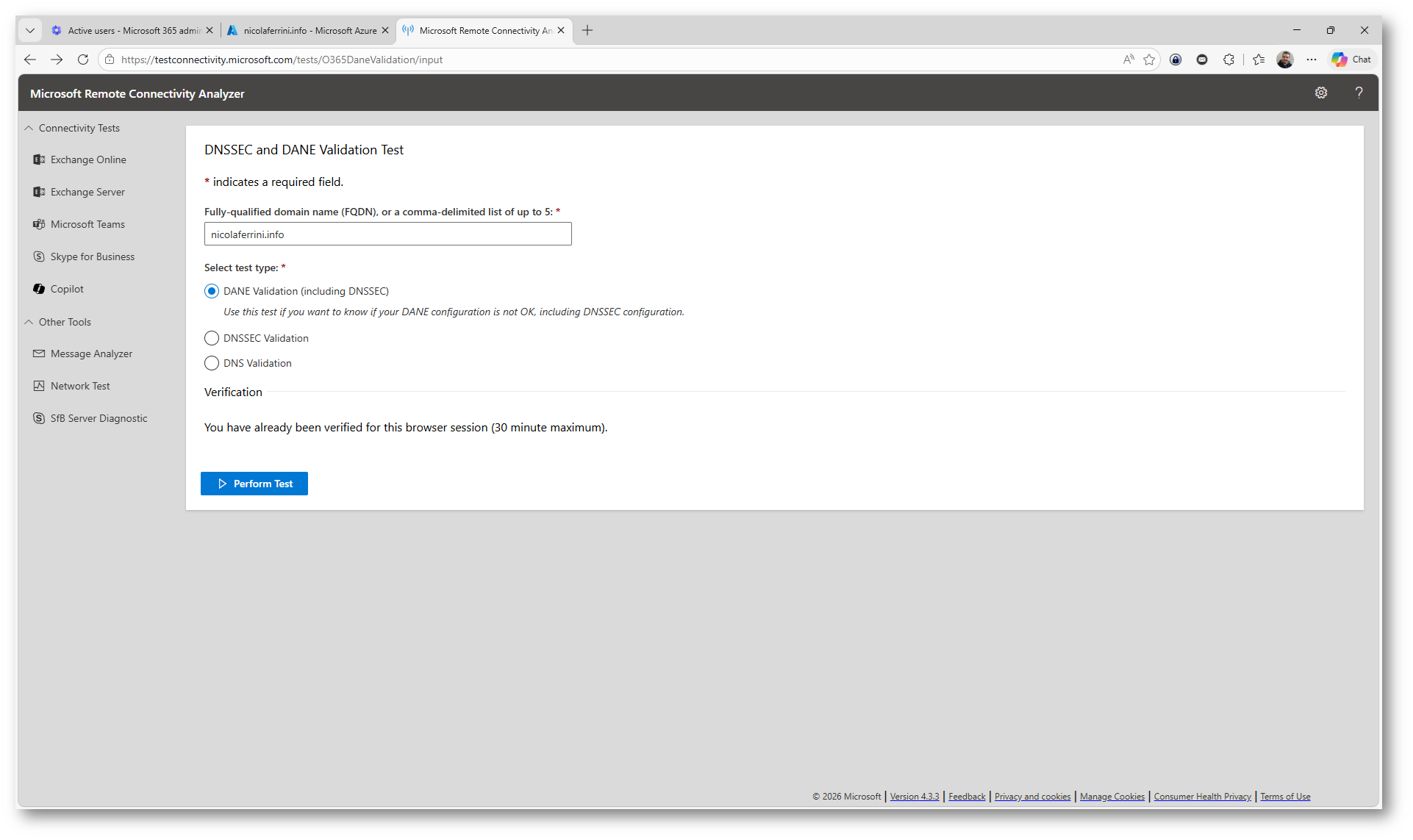 Eseguite nuovamente il test DNSSEC e DANE Validation tramite il Microsoft Remote Connectivity Analyzer all’indirizzo https://testconnectivity.microsoft.com/tests/O365DaneValidation/input per verificare lo stato della configurazione.