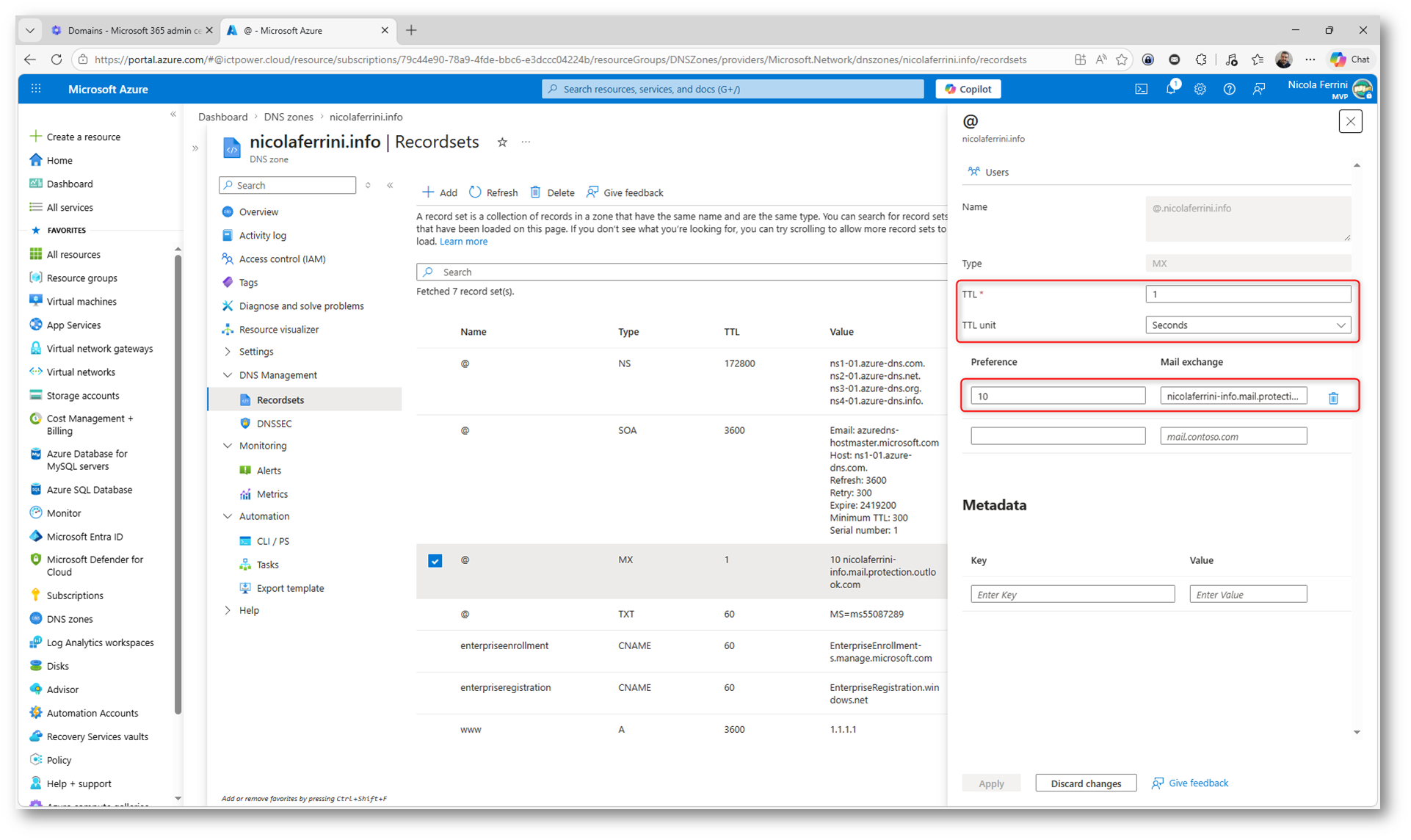 Figura 3: Modifica del TTL del record MX in Azure DNS per velocizzare la propagazione delle modifiche e garantire coerenza durante la configurazione di SMTP DANE