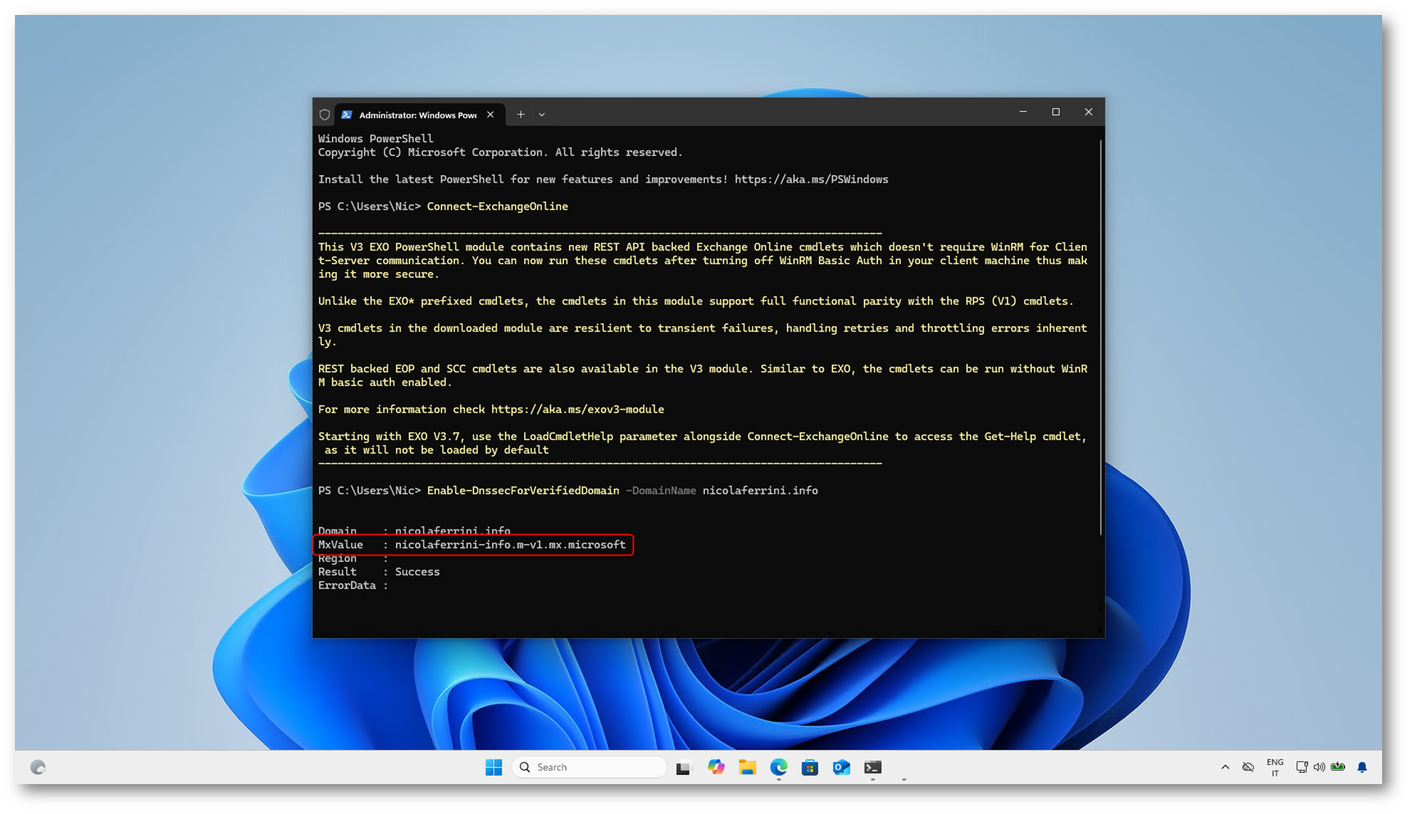 Questa operazione è fondamentale perché consente a Microsoft 365 di preparare il dominio per l’utilizzo con DNSSEC, restituendo anche il valore corretto del nuovo record MX da utilizzare.