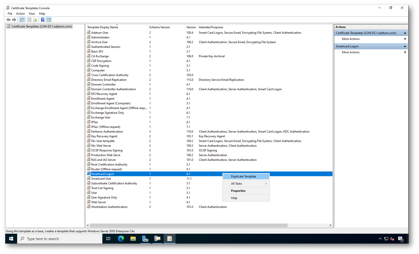 Fate quindi clic con il tasto destro su Smartcard Logon e selezionate Duplicate Template. Questa operazione apre la finestra di configurazione del nuovo template, che personalizzerete nei passaggi successivi.