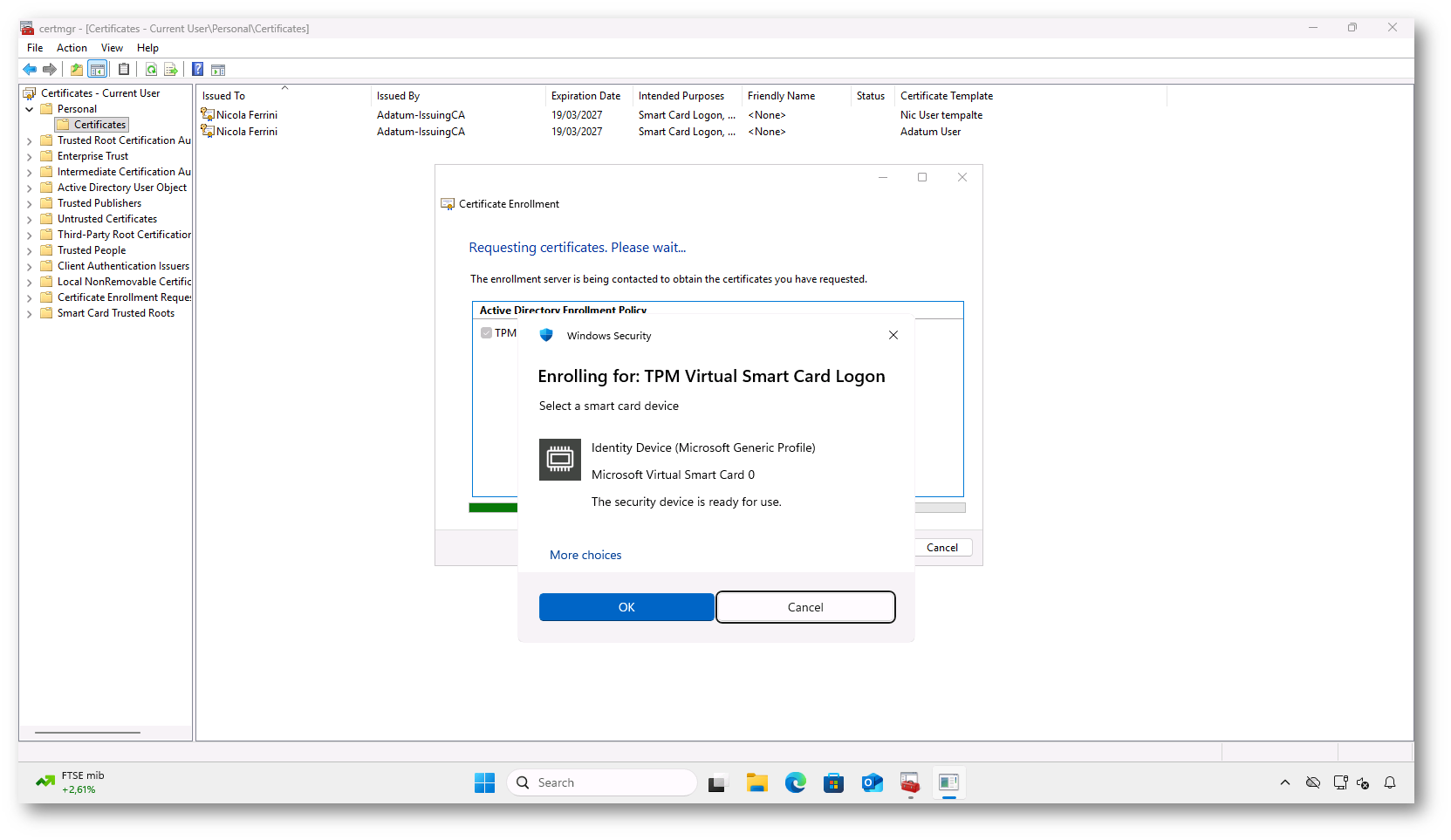 Figura 10: Richiesta del certificato tramite certmgr.msc e selezione della Microsoft Virtual Smart Card durante l’enrollment