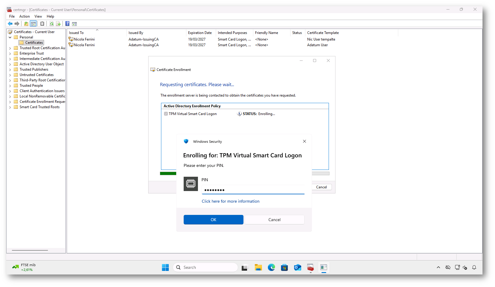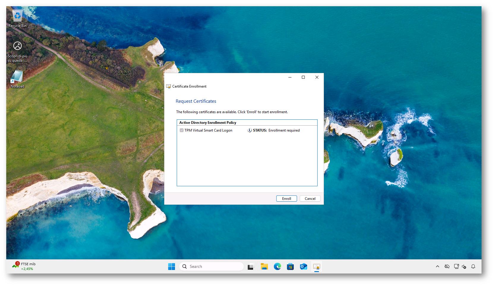 Cliccando sulla notifica, Windows apre automaticamente la procedura di Certificate Enrollment, mostrando il template TPM Virtual Smart Card Logon con stato Enrollment required. A questo punto procedete con Enroll per avviare la richiesta del certificato.