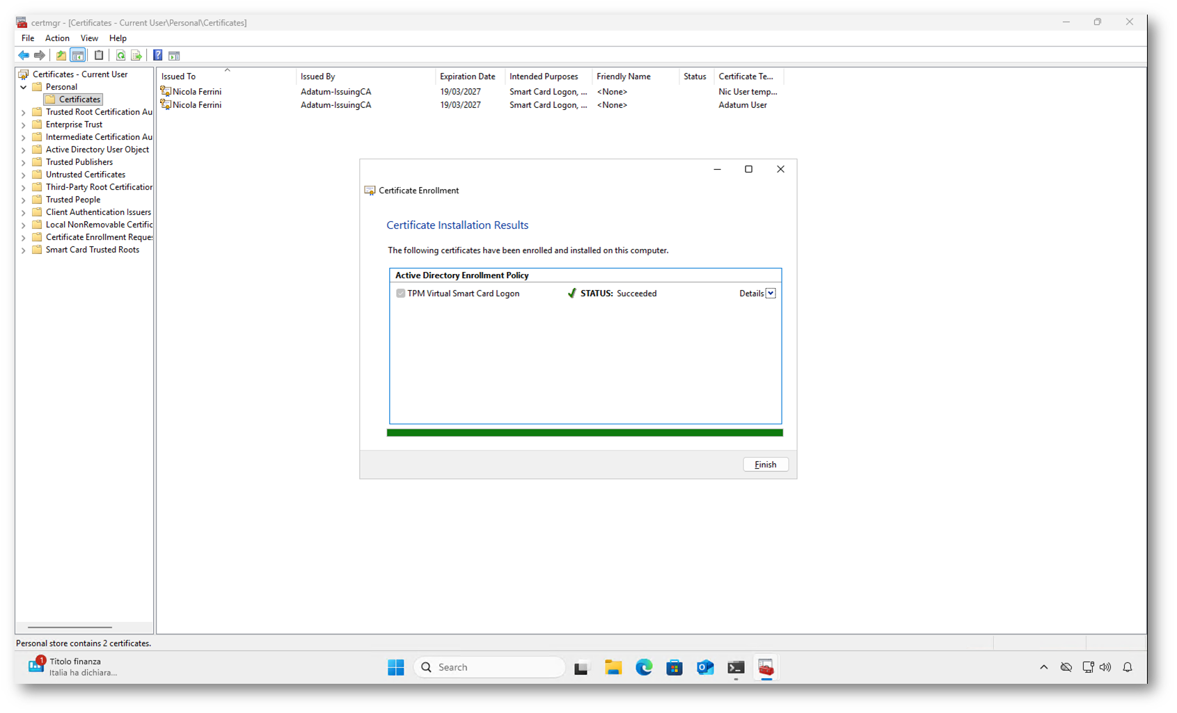 Al termine dell’enrollment, verificate la presenza del certificato nella console certmgr.msc. Aprite Certificates – Current User, espandete Personal → Certificates e controllate l’elenco dei certificati disponibili.