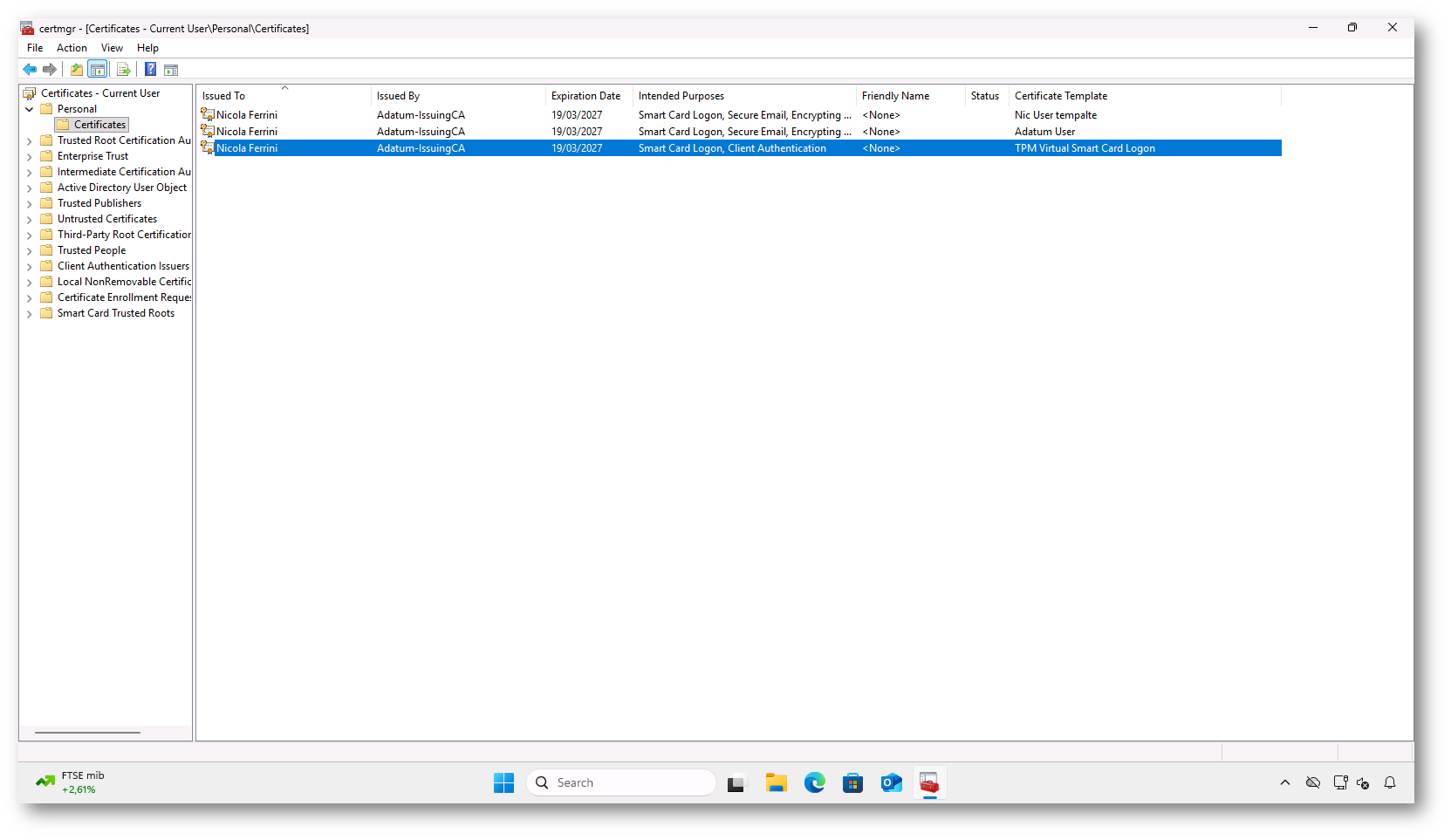 Figura 13: Verifica del certificato emesso tramite template TPM Virtual Smart Card Logon nella console certmgr.msc