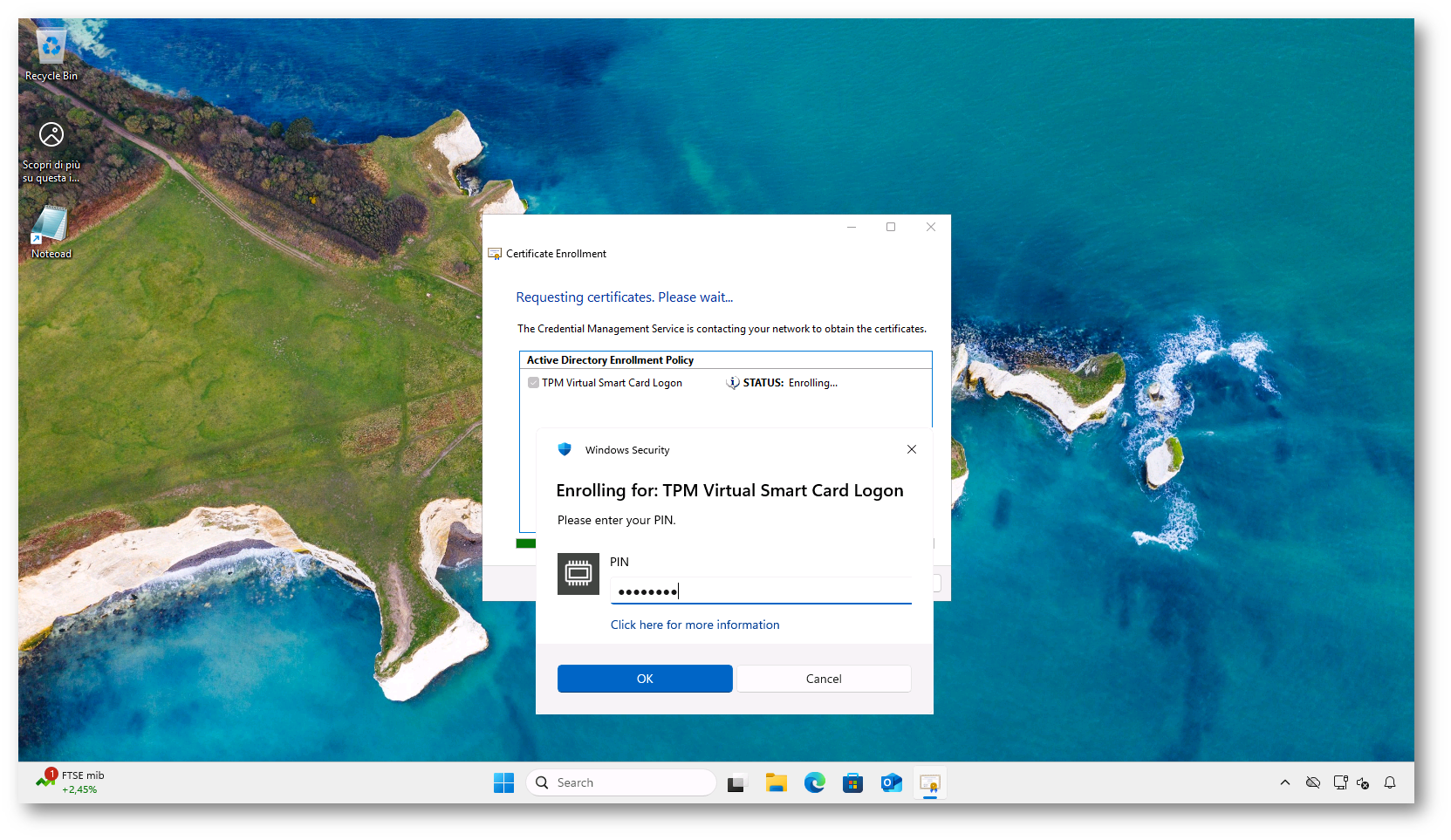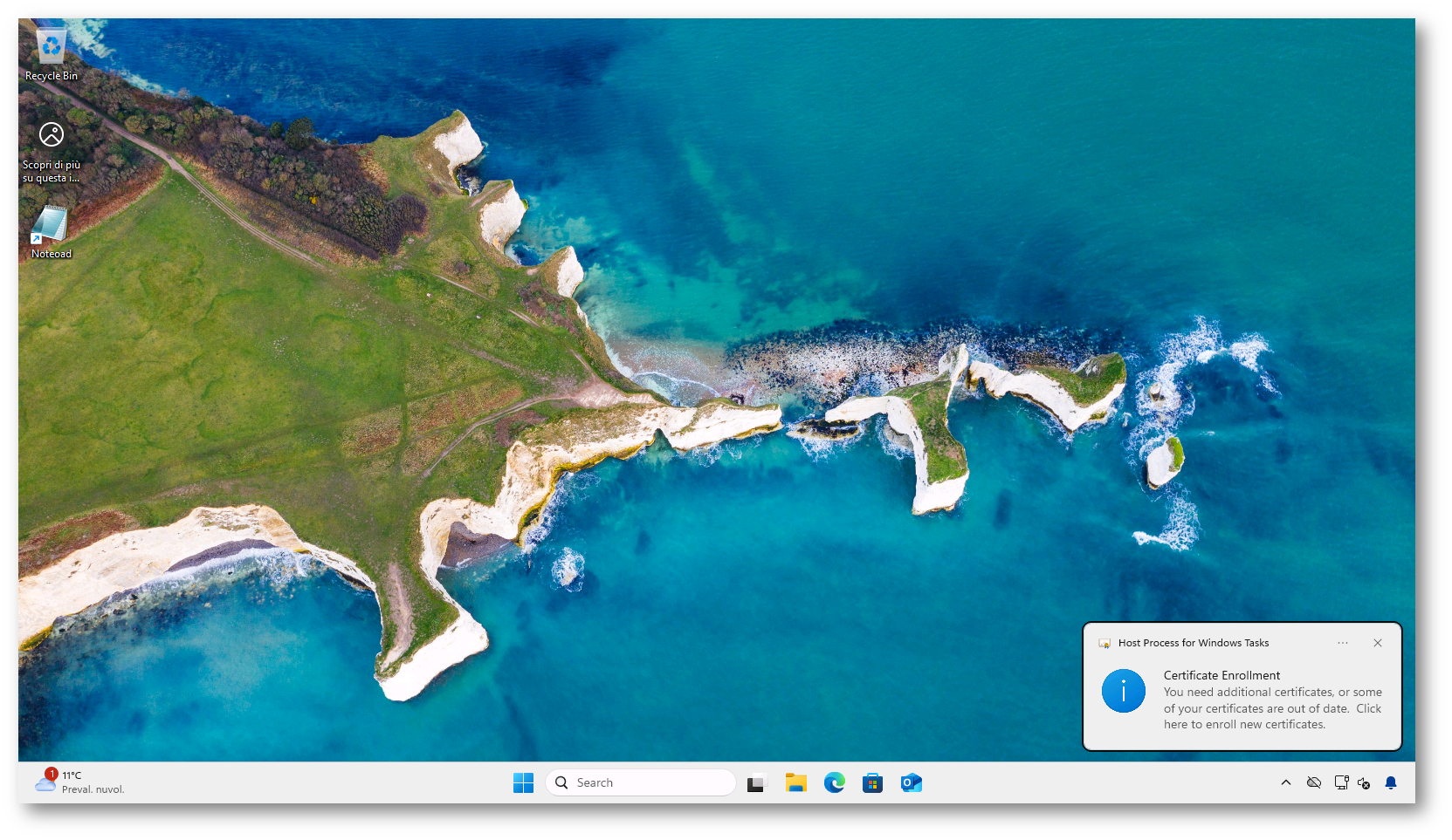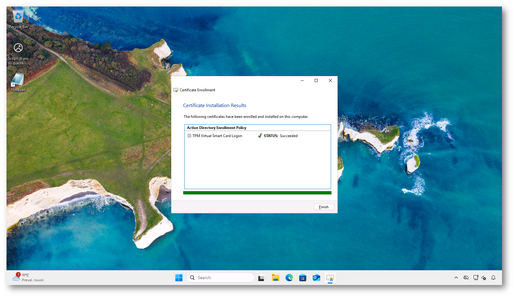 Se decidete di utilizzare l’autoenrollment tramite GPO, all’utente viene mostrata una toast notification che richiede di completare il deployment del certificato. Questo comportamento è normale perché, nel caso delle Virtual Smart Card, è necessario l’intervento dell’utente per selezionare il dispositivo e inserire il PIN.