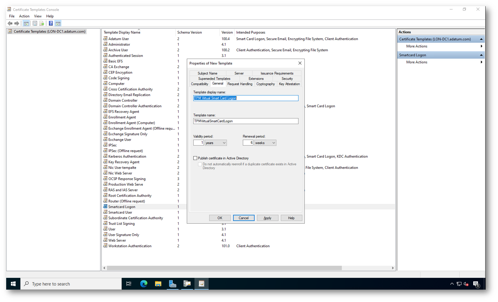 Figura 7: Pubblicazione del template TPM Virtual Smart Card Logon nella Certification Authority