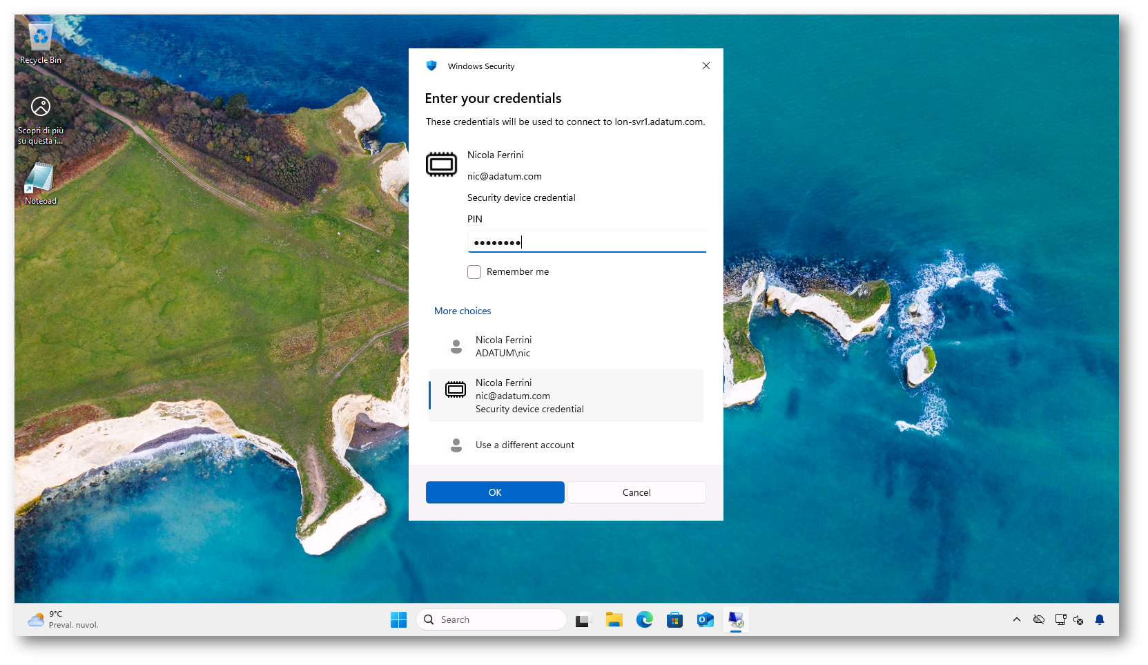 Selezionate Connect per avviare la connessione. Quando viene richiesto il metodo di autenticazione, scegliete l’opzione Smart card oppure selezionate More choices e scegliete la Virtual Smart Card disponibile.