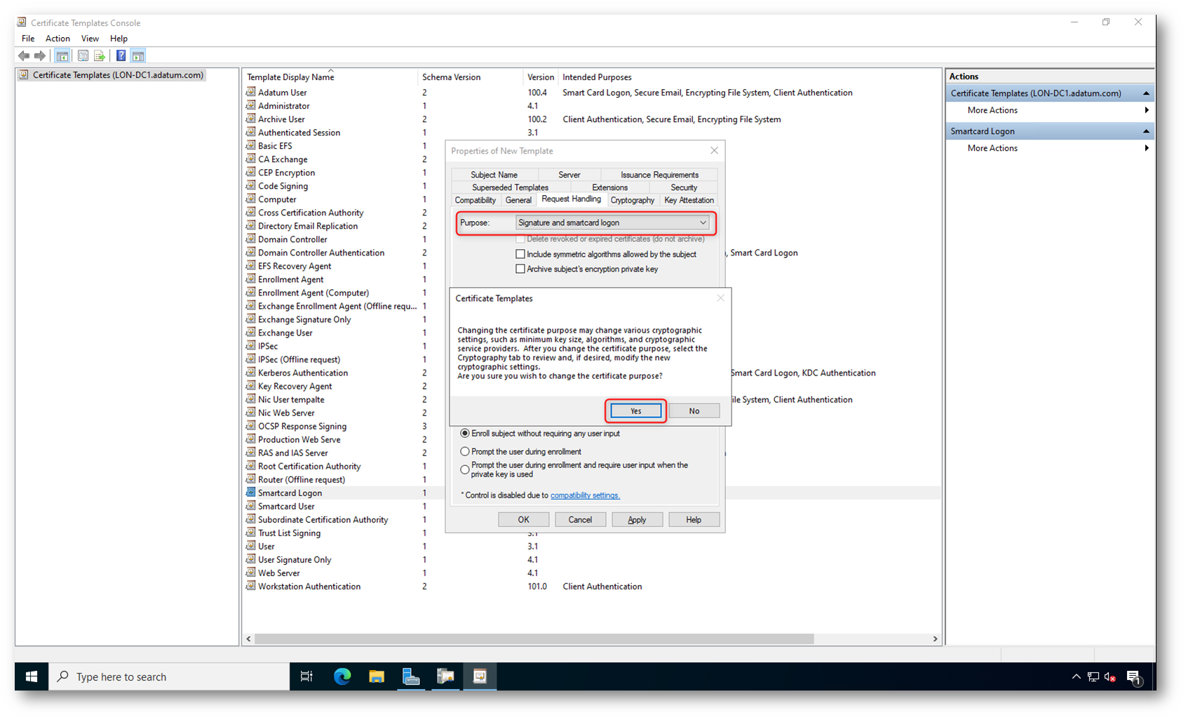 Figura 3: Impostazione dello scopo del certificato su Signature and smartcard logon e conferma della modifica