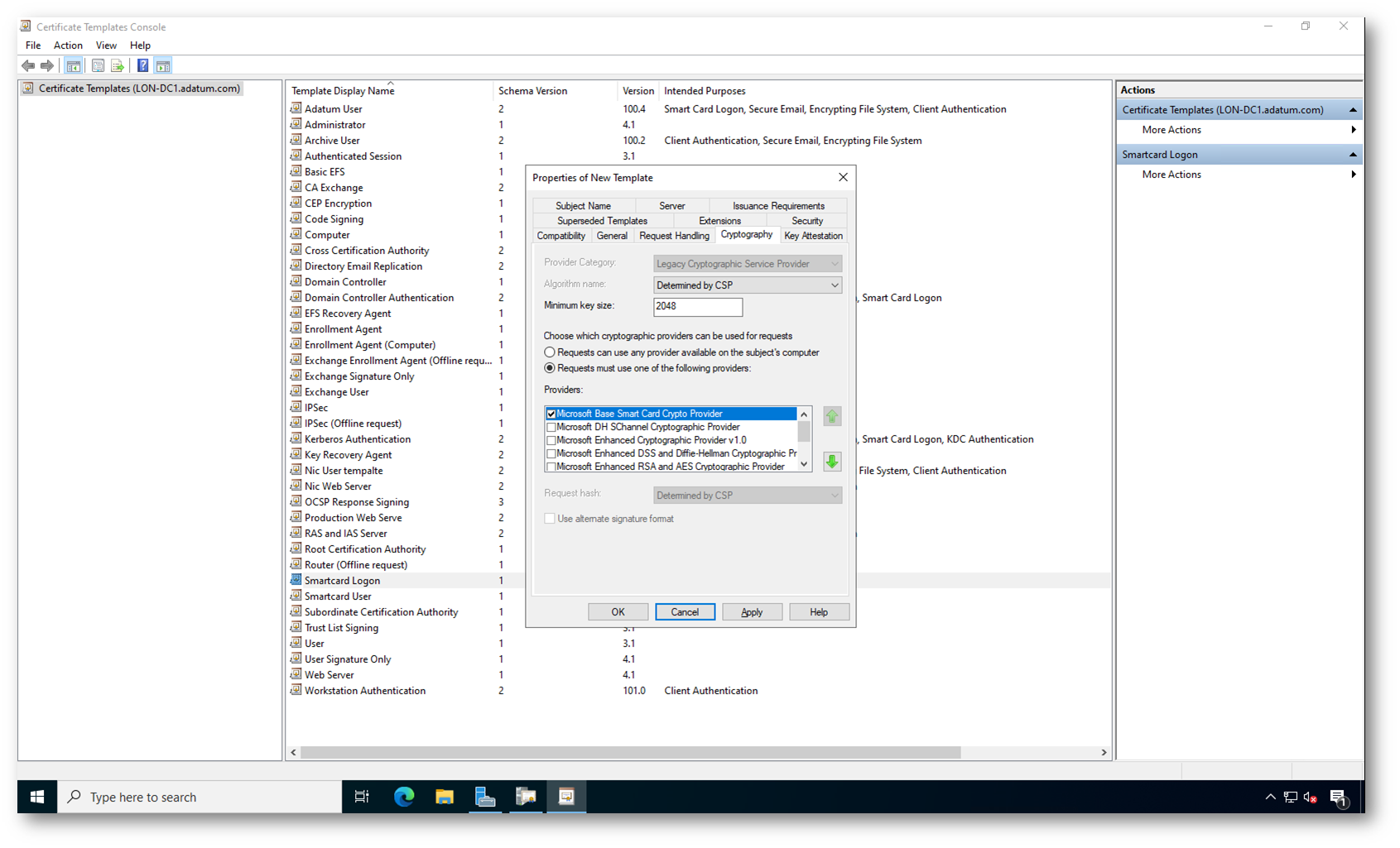 Spostatevi nella scheda Cryptography e verificate le impostazioni del provider crittografico. Configurate la dimensione minima della chiave impostandola a 2048 bit, valore consigliato per garantire un adeguato livello di sicurezza.