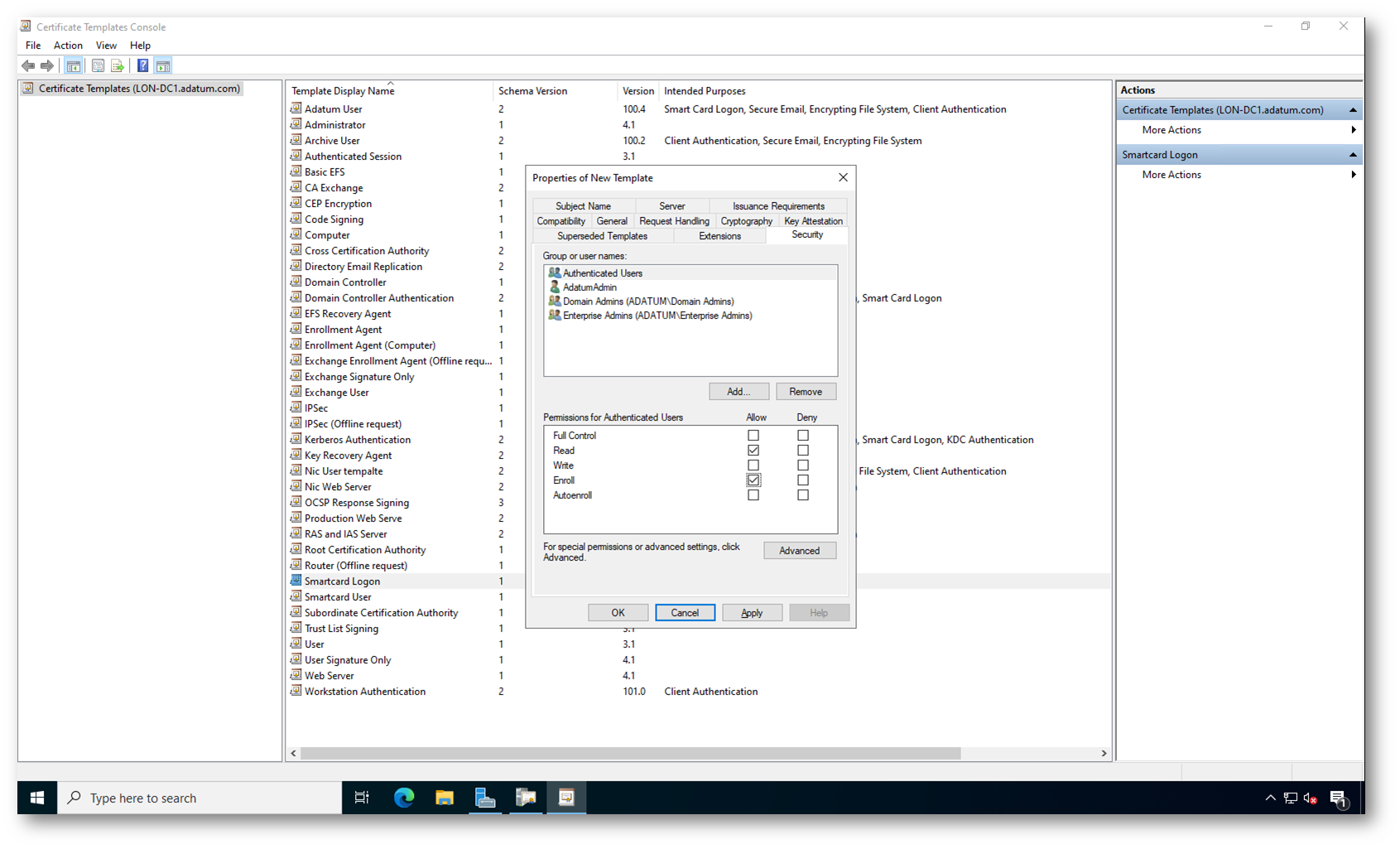 Spostatevi nella scheda Security e configurate i permessi per i gruppi che dovranno richiedere il certificato. Individuate il gruppo Authenticated Users e verificate che siano abilitati i permessi Read e Enroll.