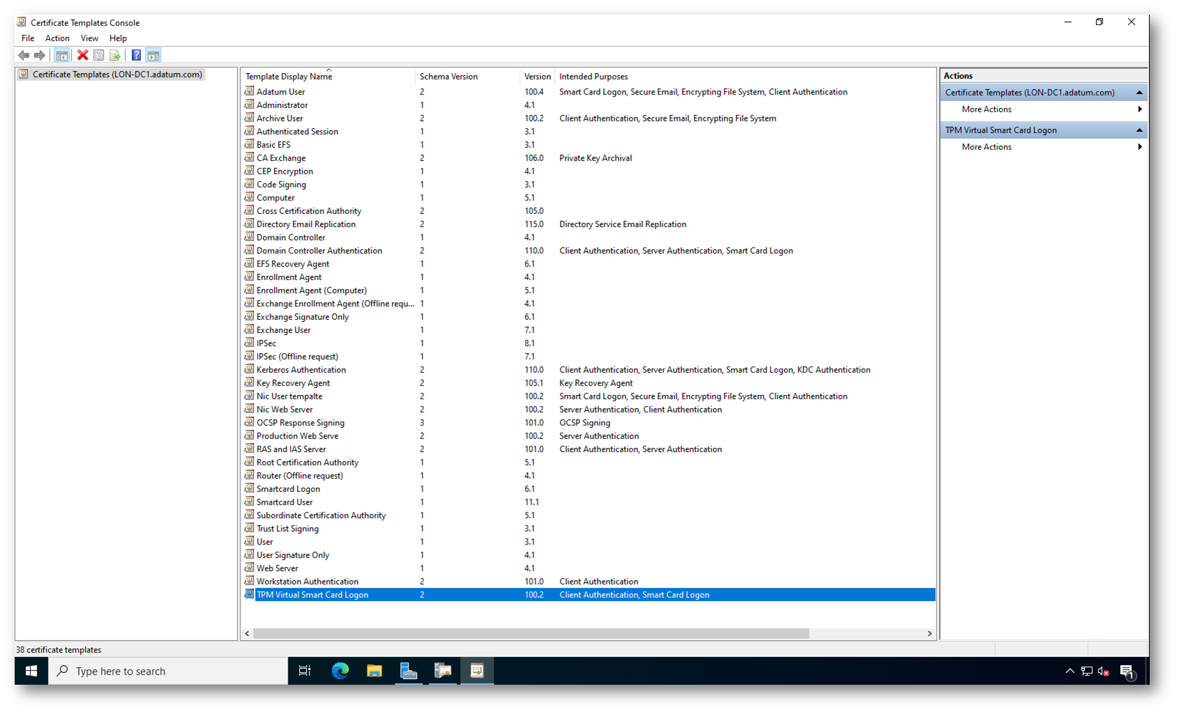Figura 6: Template TPM Virtual Smart Card Logon creato e visibile nell’elenco dei Certificate Templates