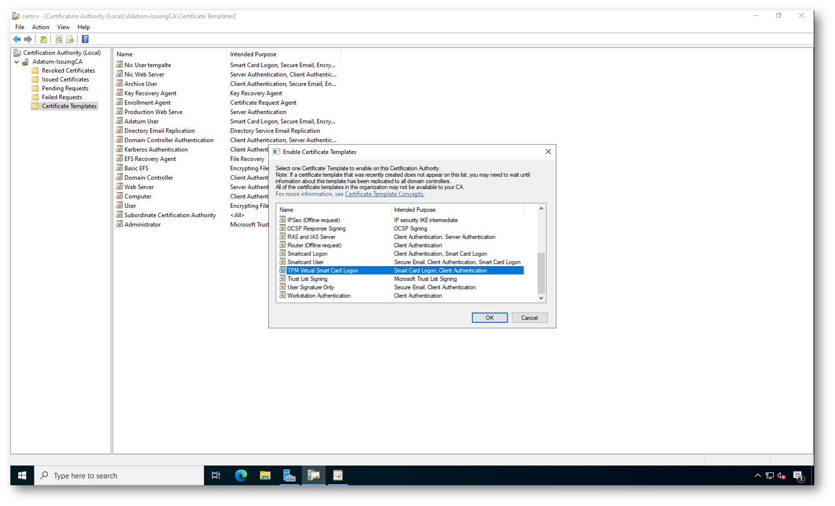 Nella finestra Enable Certificate Templates individuate il template TPM Virtual Smart Card Logon, selezionatelo e confermate con OK. Con questa operazione rendete il template disponibile per l’emissione dei certificati da parte della Certification Authority.