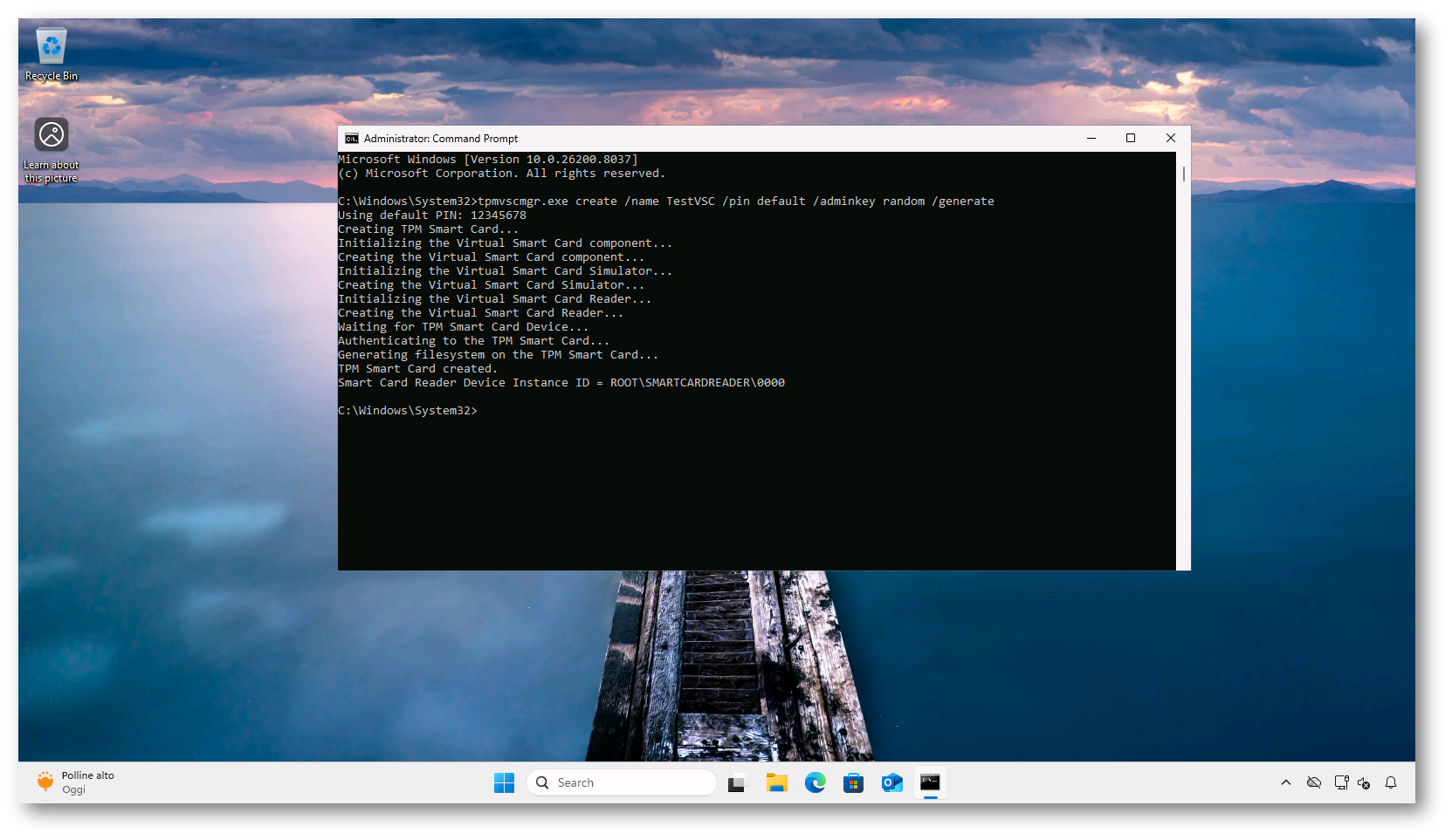 tpmvscmgr.exe create /name TestVSC /pin default /adminkey random /generate