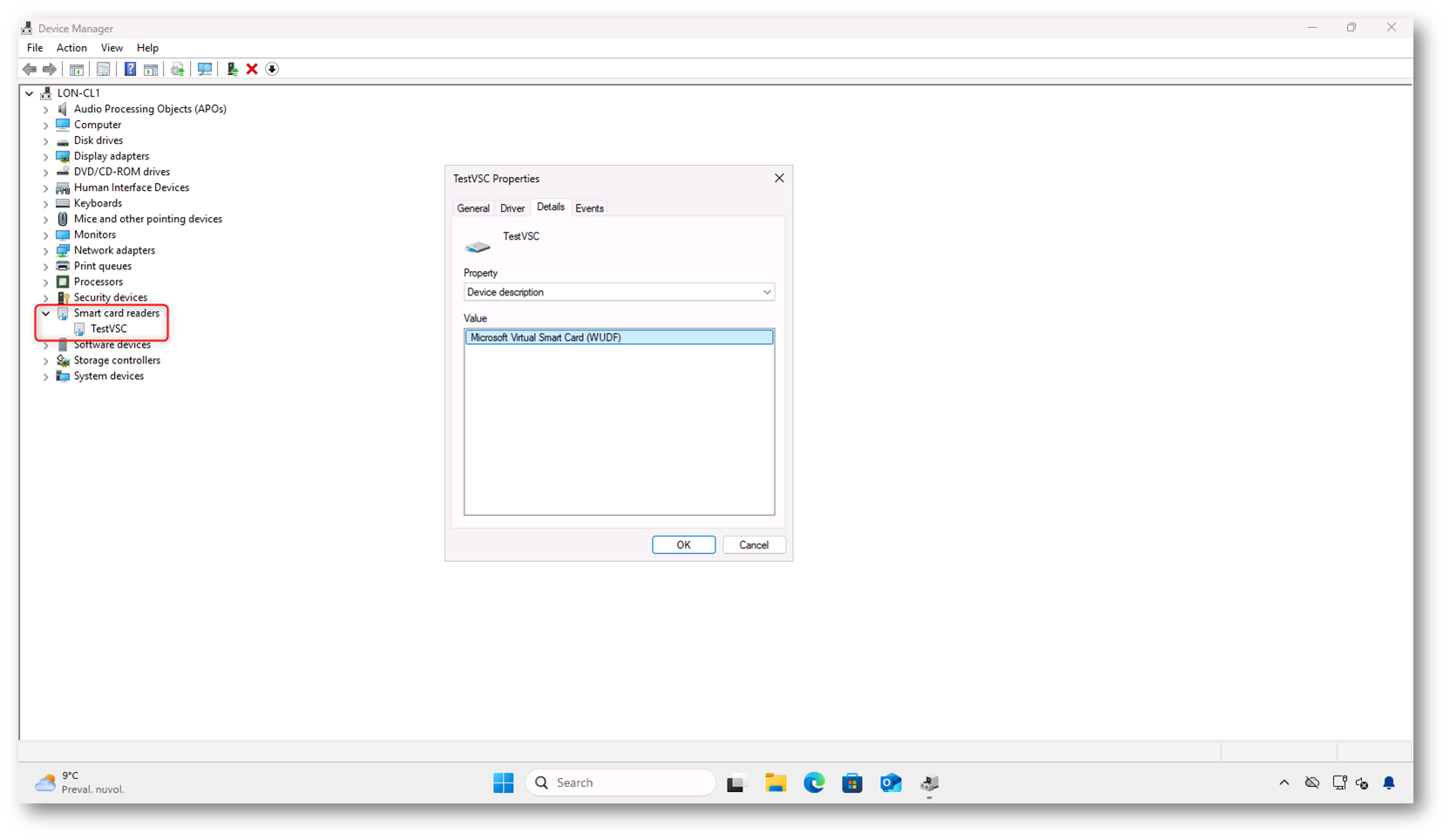 Aprendo le proprietà del dispositivo e selezionando la scheda Details, potete osservare che il valore riportato è Microsoft Virtual Smart Card (WUDF). Questo conferma che il dispositivo è una Virtual Smart Card basata su TPM e non una smart card fisica.