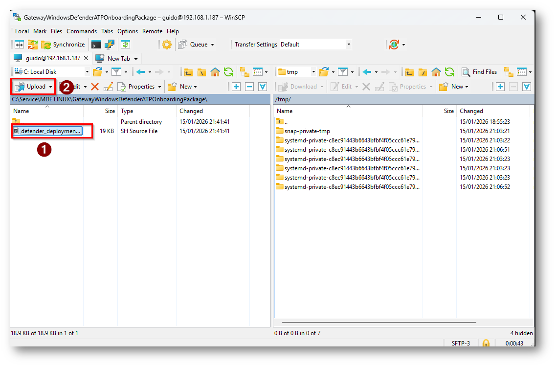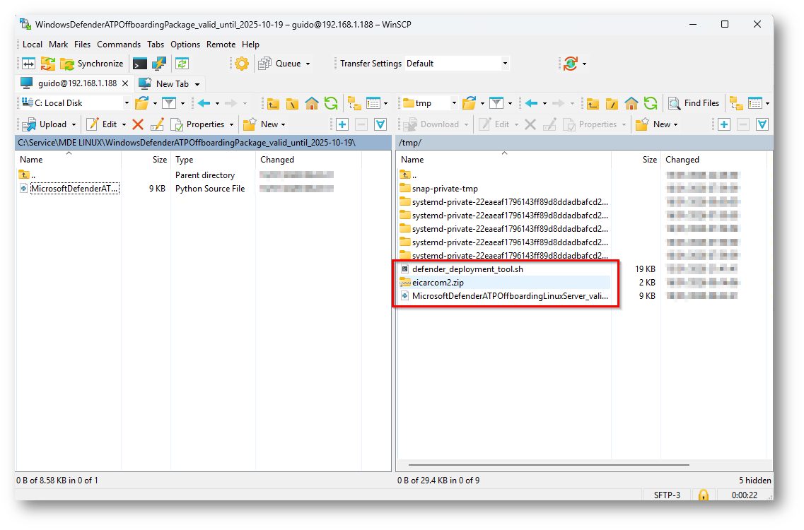 Ora tramite WinScp procederò a copiarlo all’interno del dispositivo Linux nella cartella /tmp insieme al file per l’installazione del Deployment Tool NB: devono essere nella stessa cartella per procedere all’offboarding o dovrete passare il percorso completo