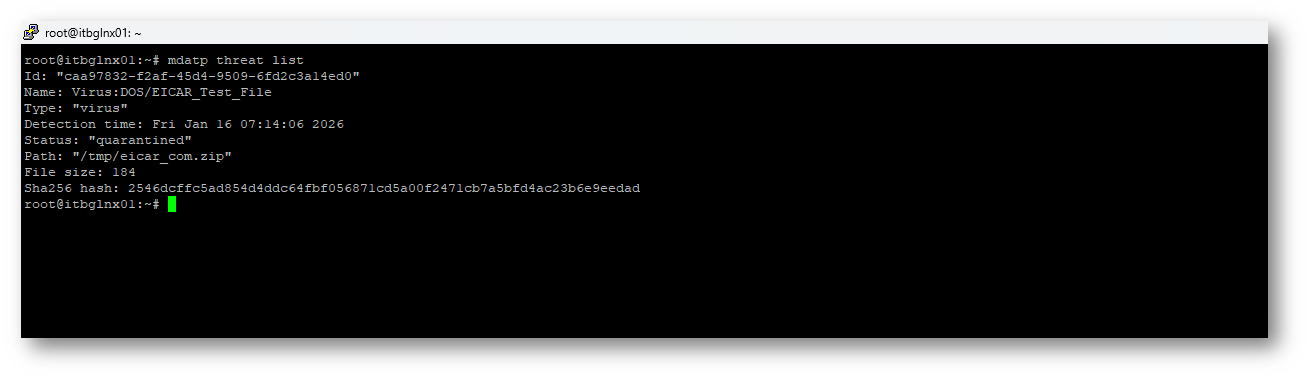 Comando per verificare i Threat attivi “mdatp threat list”