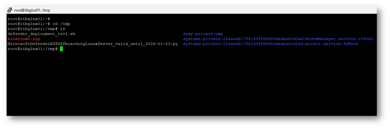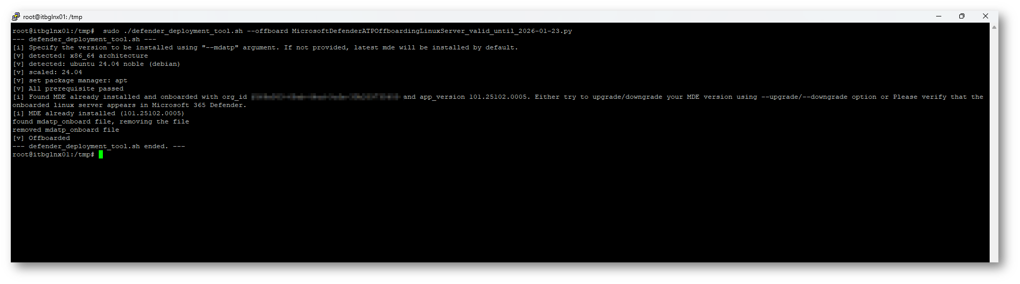Ora siete pronti per eseguire il comando di Offboarding del dispositivo “sudo ./defender_deployment_tool.sh –offboard MicrosoftDefenderATPOffboardingLinuxServer_valid_until_2026-01-23.py” la parte in grassetto cambierà in base alla data di scadenza del vostro script python