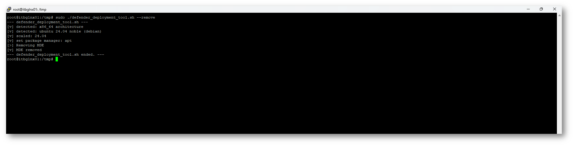 Figura 32: Defender for Endpoint rimosso correttamente dalla macchina Linux