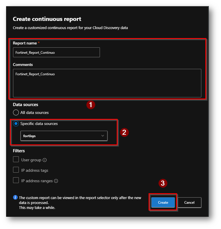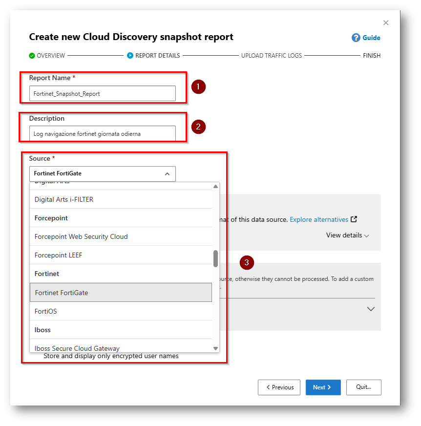 Figura 11: Scegliete un nome ed una descrizione parlante per il report, e la sorgente (il vostro firewall) nel mio caso “Fortinet FortiGate”
