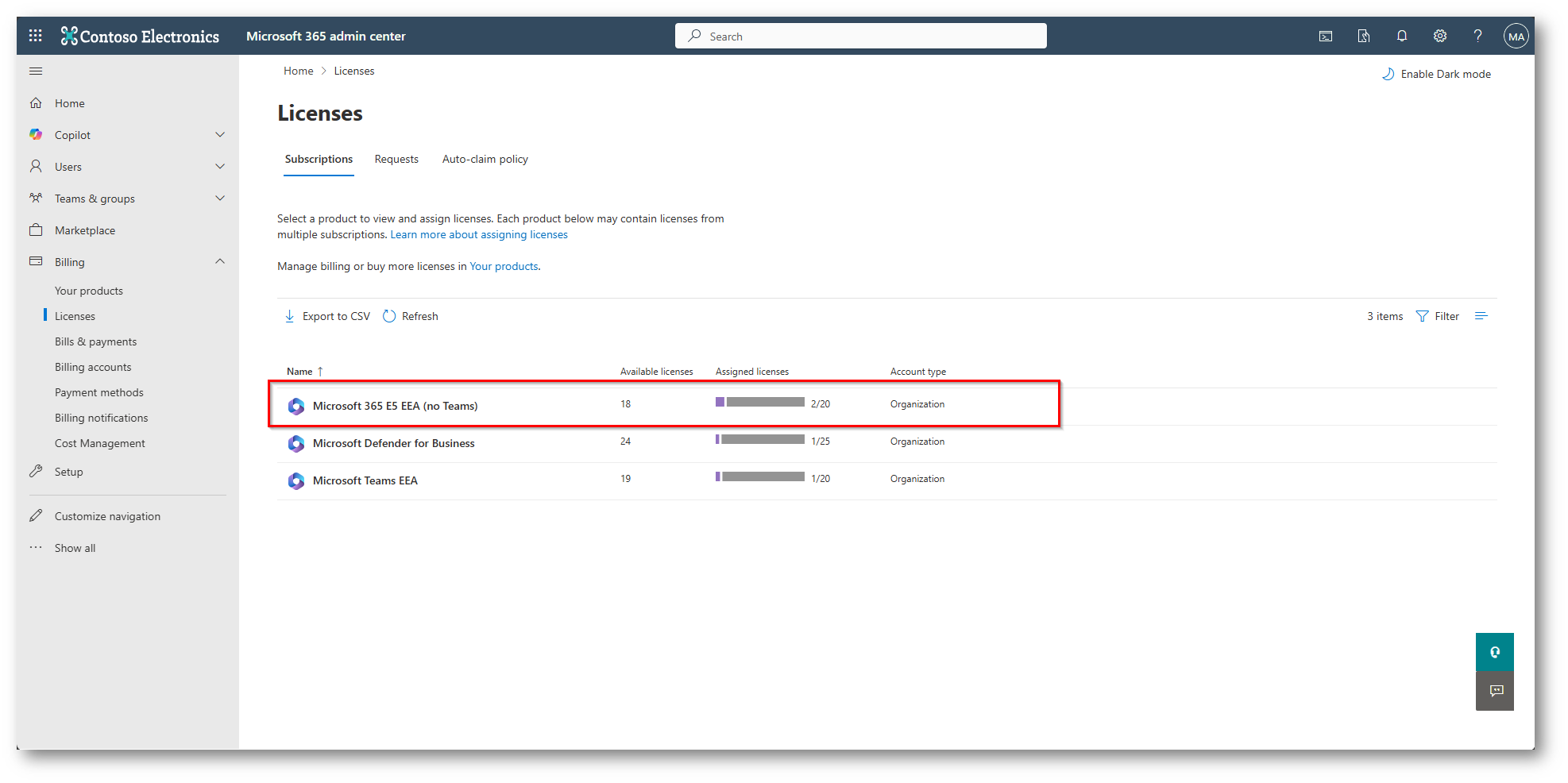 Figura 2: Licenza Microsoft 365 E5 all’interno del Tenant di demo per poter utilizzare Microsoft Defender for Cloud Apps