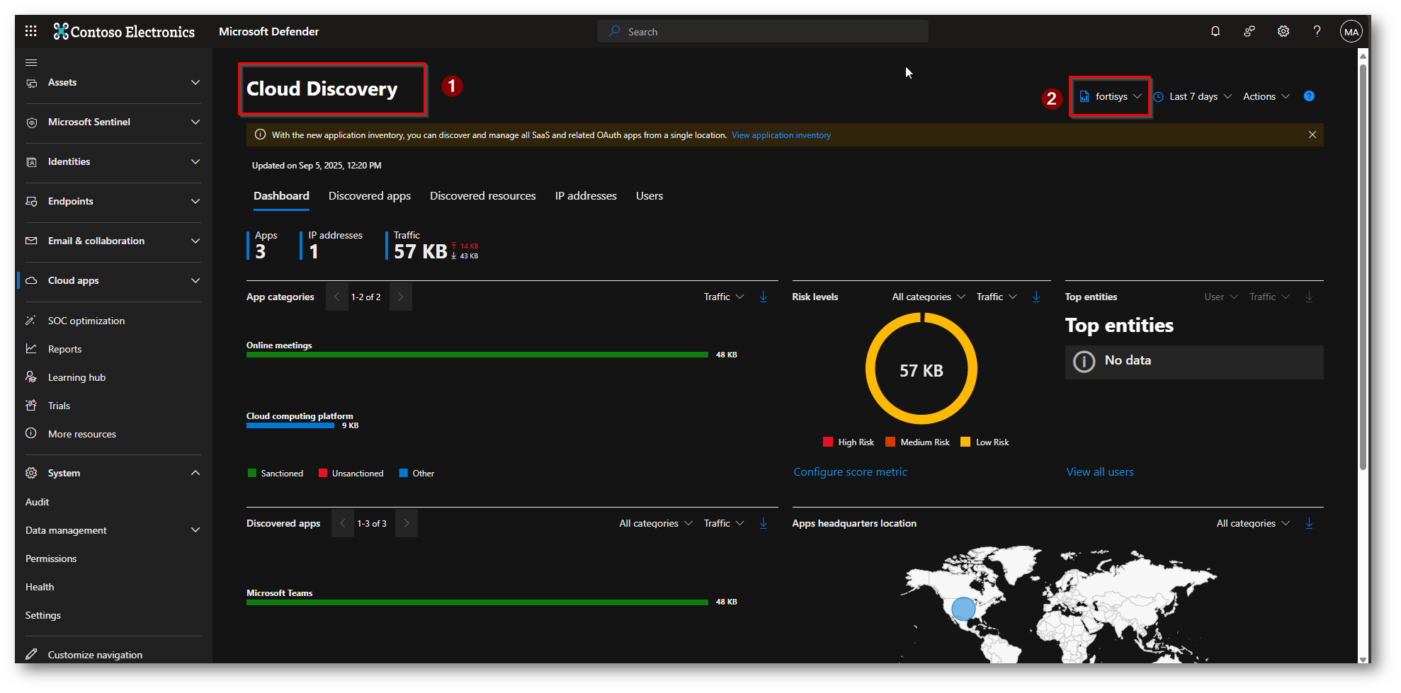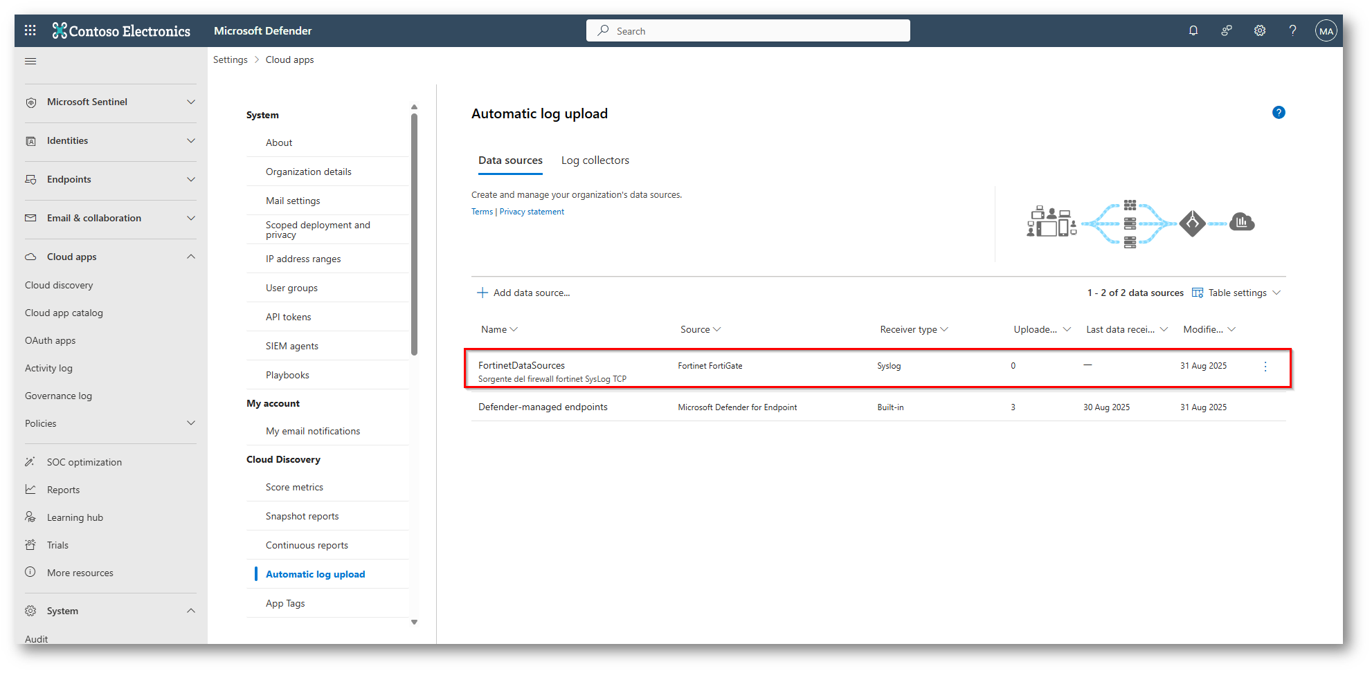 Come primo passaggio dovremo configurare una log source all’interno del portale di Microsoft Defender XDR nella sezione di Cloud Apps, nel mio caso sarà il firewall FortiGate: