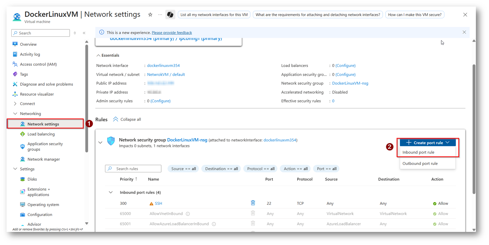 Figura 28: Creazione Inbound rule sulla scheda di rete della VM su cui installerò Docker